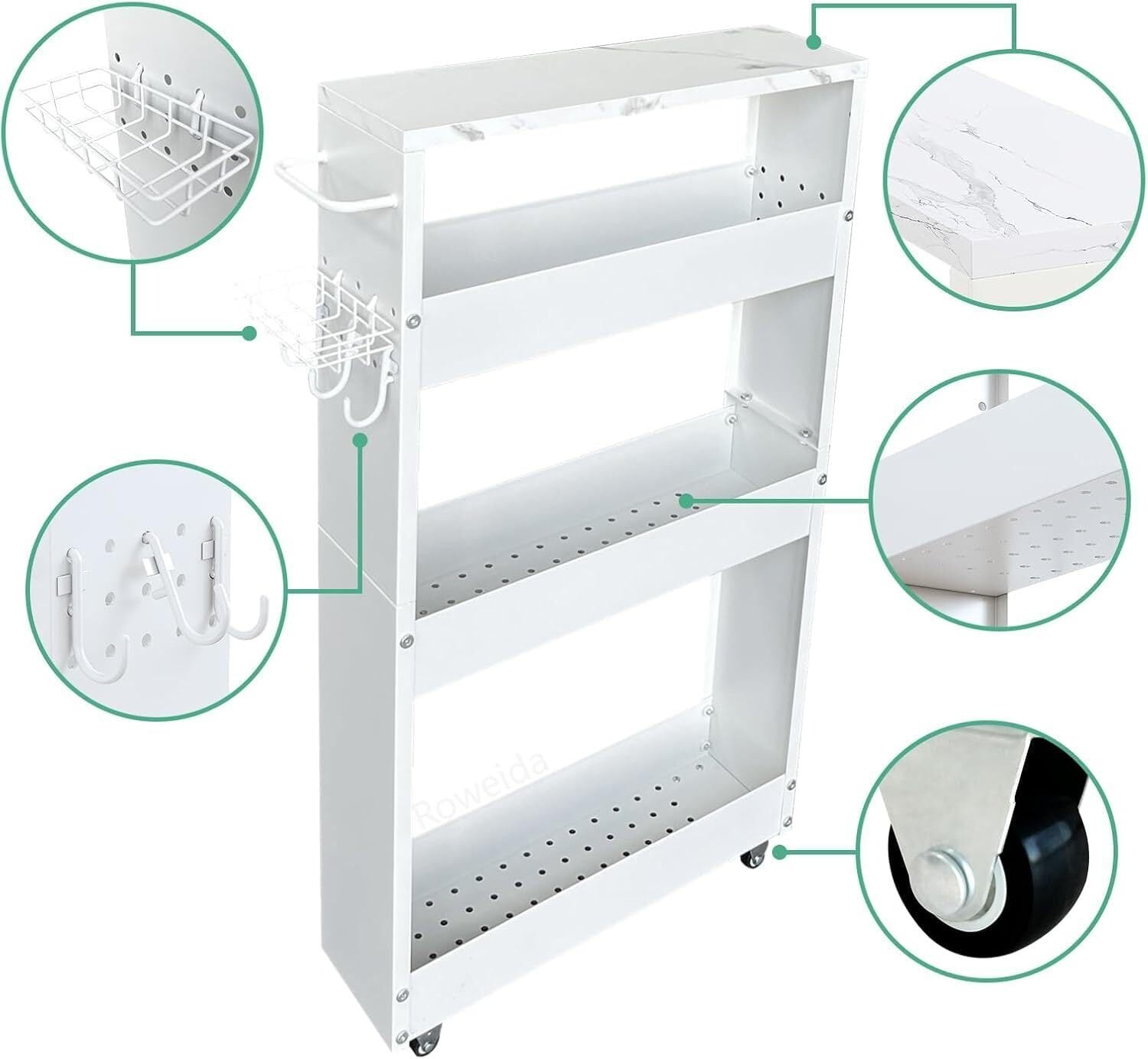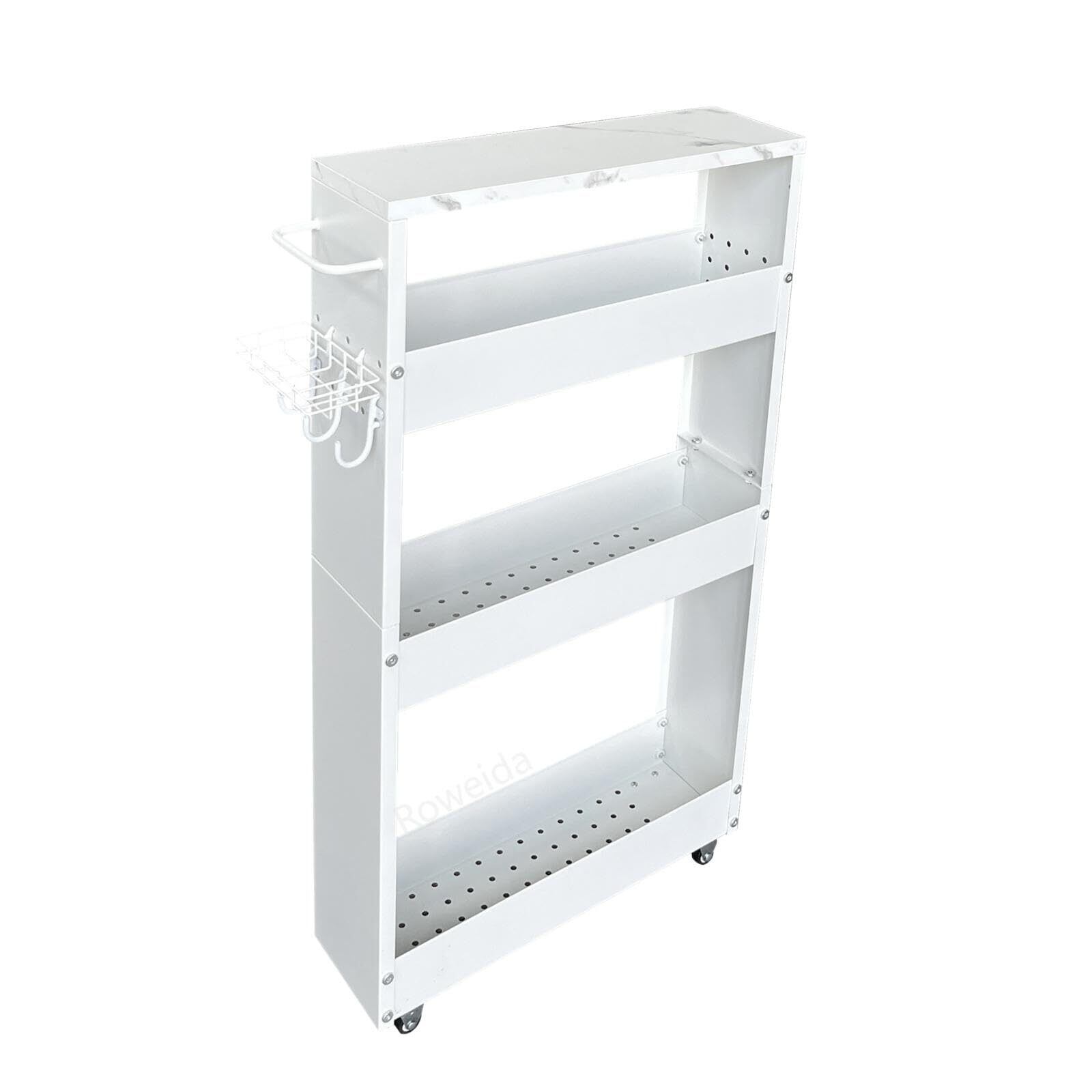 Roweida キッチンワゴン隙間収納スリム13 cm 移動式隙間ラック 冷蔵庫横 洗面所 ラック 隙間棚 4段 洗濯機横 スリムワゴン 細い棚 調味料棚 メタルフレーム木製天板 ホワイト