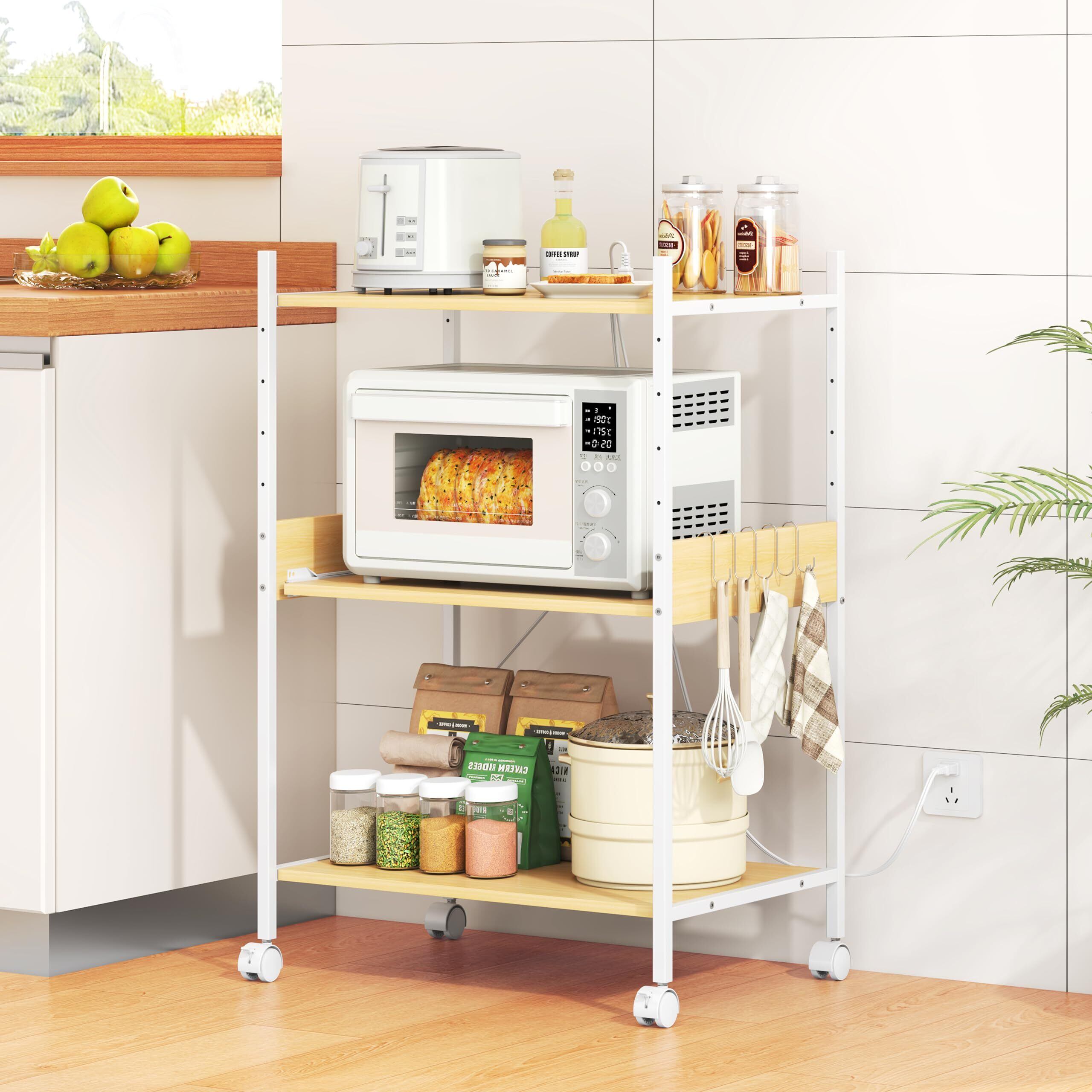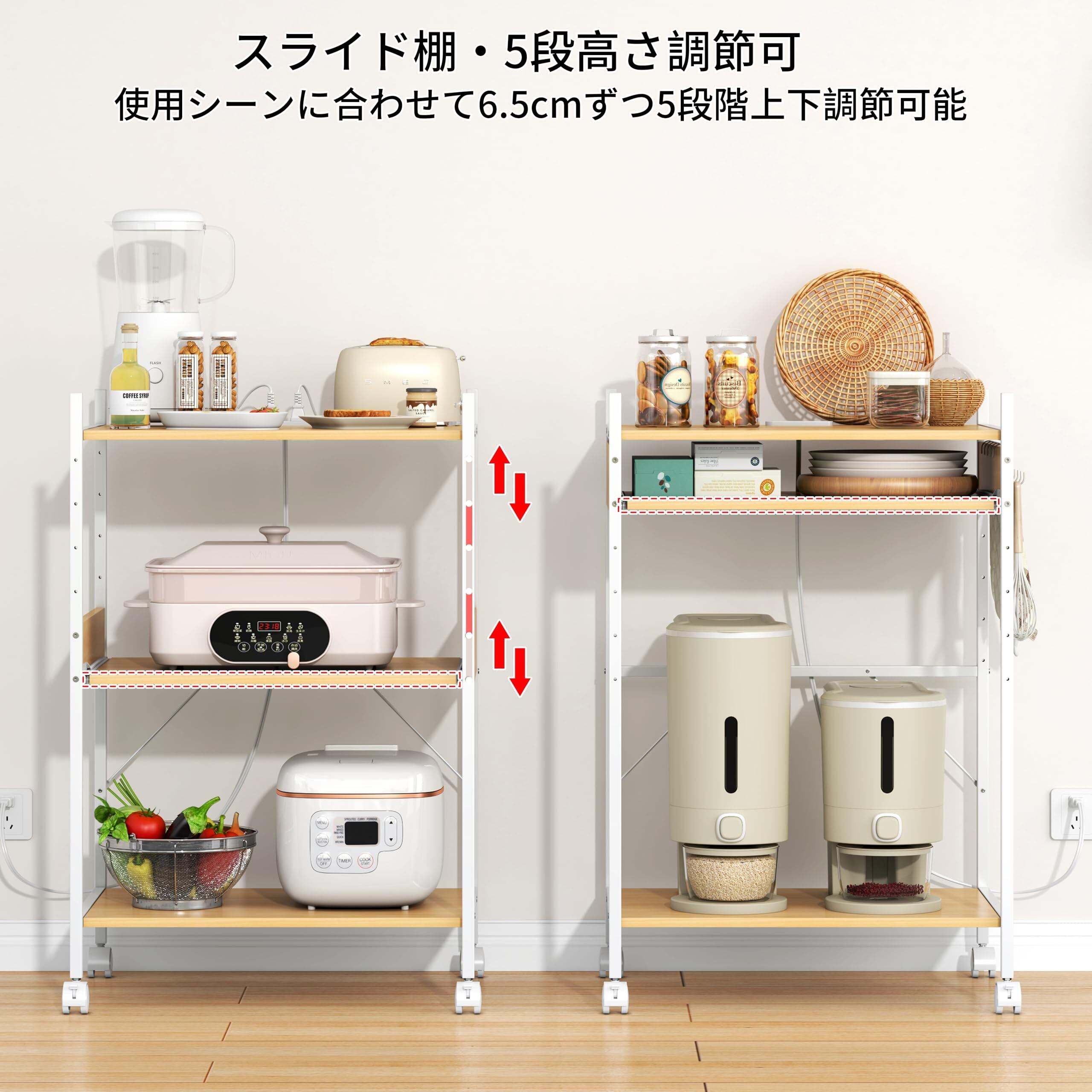 LunarLight レンジラック レンジ台 幅60奥行44高さ90cm コンセント付き 耐荷重112kg キッチン棚 スライド棚・高さ5段調節可能 大型レンジ対応 キャスター付き移動式とアジャスト付き固定式2機能 サイドパネル付き キッチン収納 オーペンラック おしゃれ 頑丈 スリム Sフック 強度安定 錆び防止 耐摩耗性 防水性 耐熱性機能 (ナチュラル, 幅60×奥行44×高さ90cm)