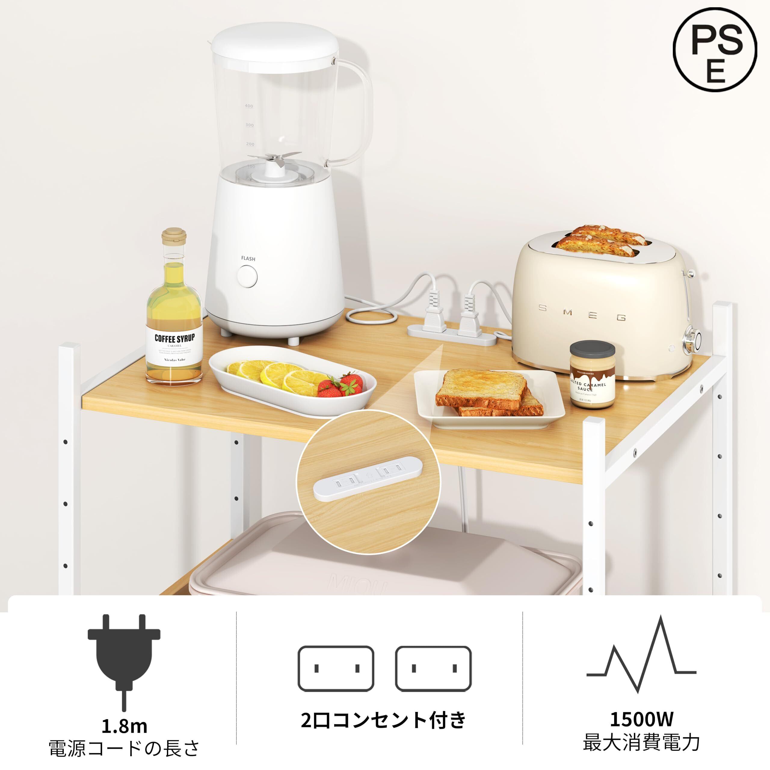 【便利なコンセントとキャスター付き】コンセント付きでミキサーや電気ケトルなどのキッチン家電をスマートに配置でき、コンセントを探す手間なく、調理や作業がスムーズに行えます。脚部にはキャスターが付いているため、お掃除の際やレイアウト変更の際も、ラックを簡単に移動できます。