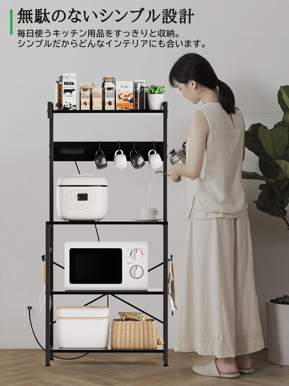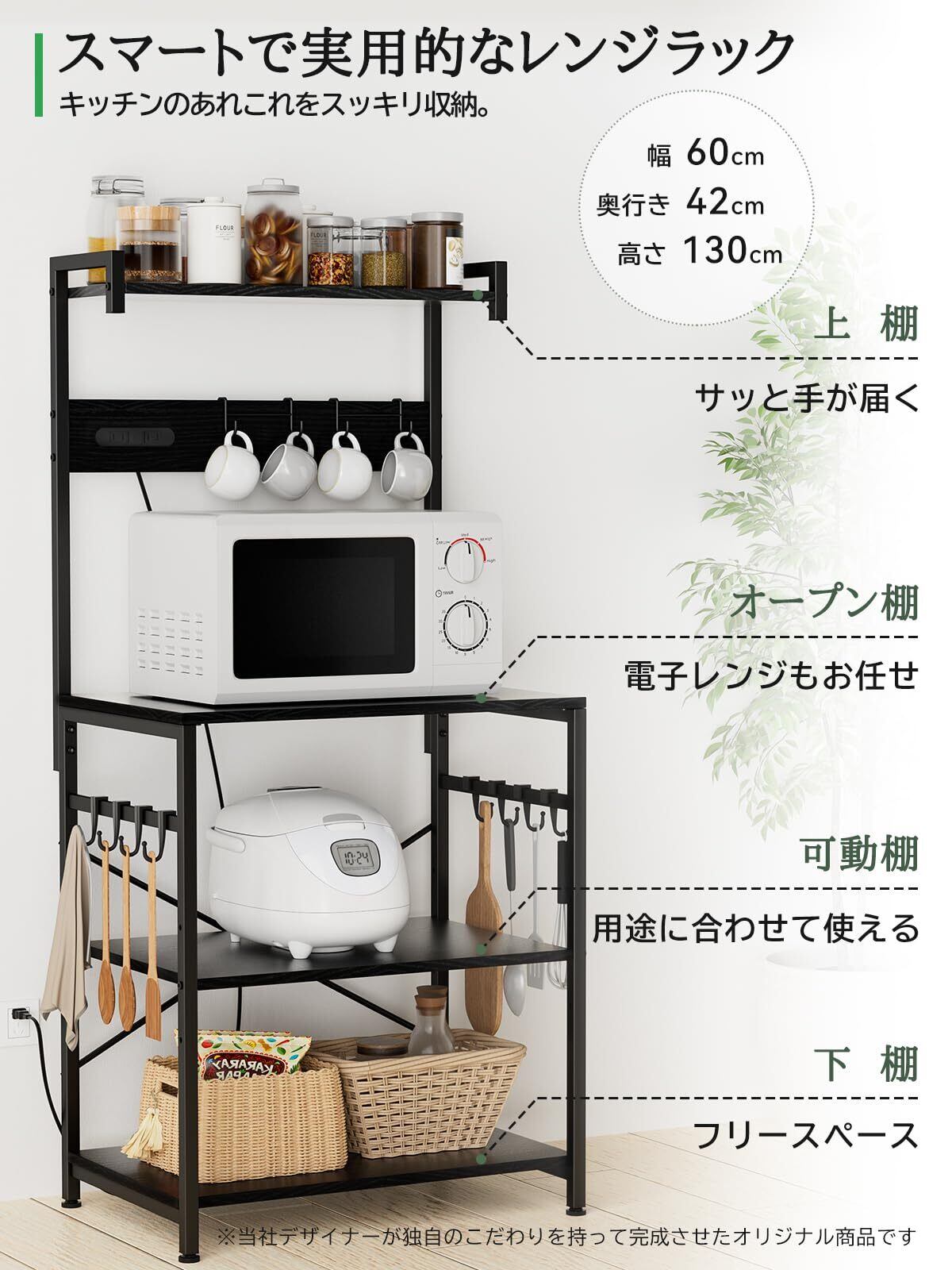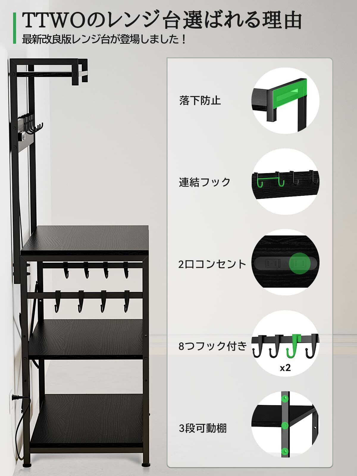 TTWO レンジ台 W60×D42×H130cm レンジラック 2口コンセント付き キッチンラック 可動棚高さ3段調整 レンジボード キッチンボード 食器棚 大型レンジ対応 スリム キッチン収納 耐荷重60kg 省スペース 頑丈 北欧 おしゃれ キッチンキャビネット レンジ置き台 フック付き (ブラック)