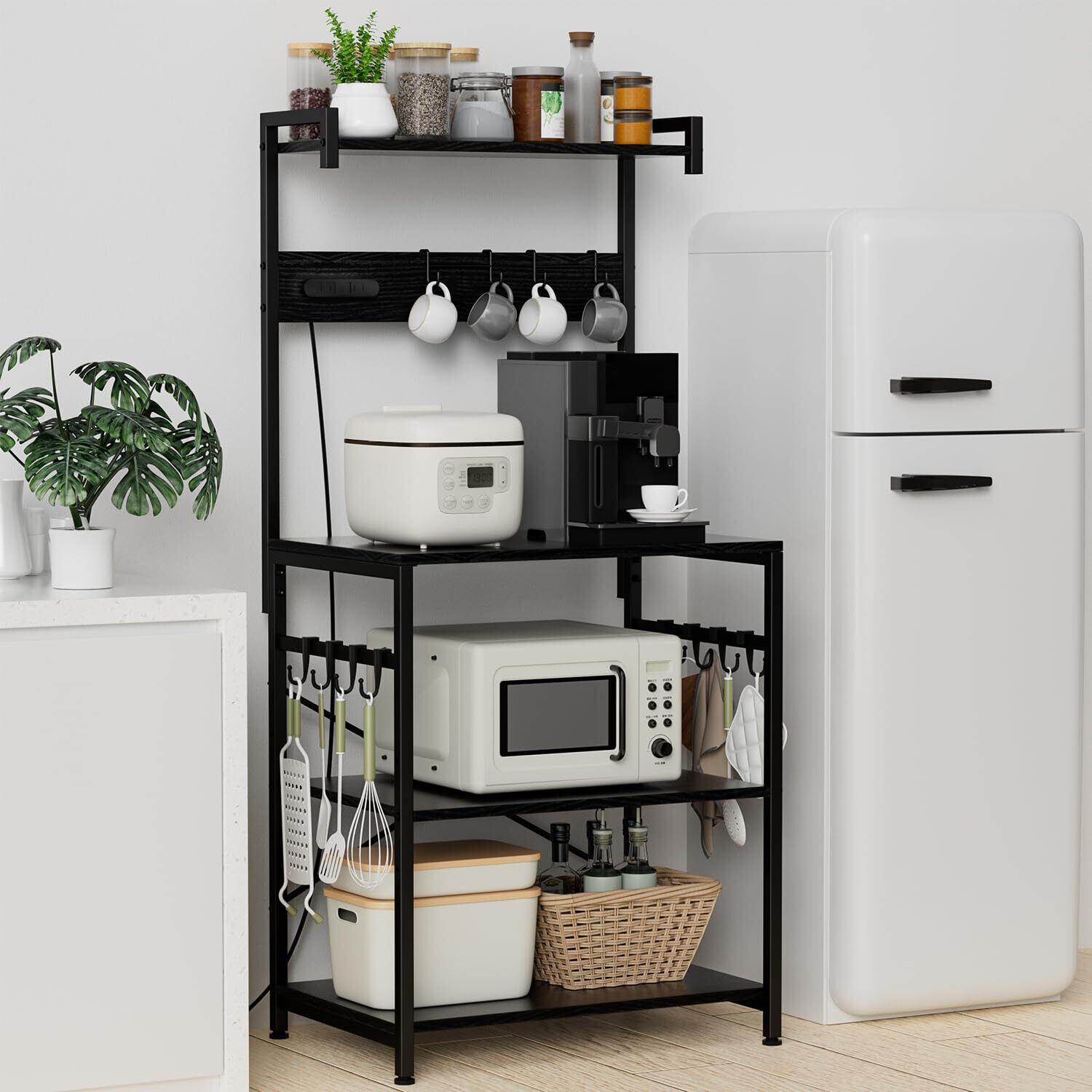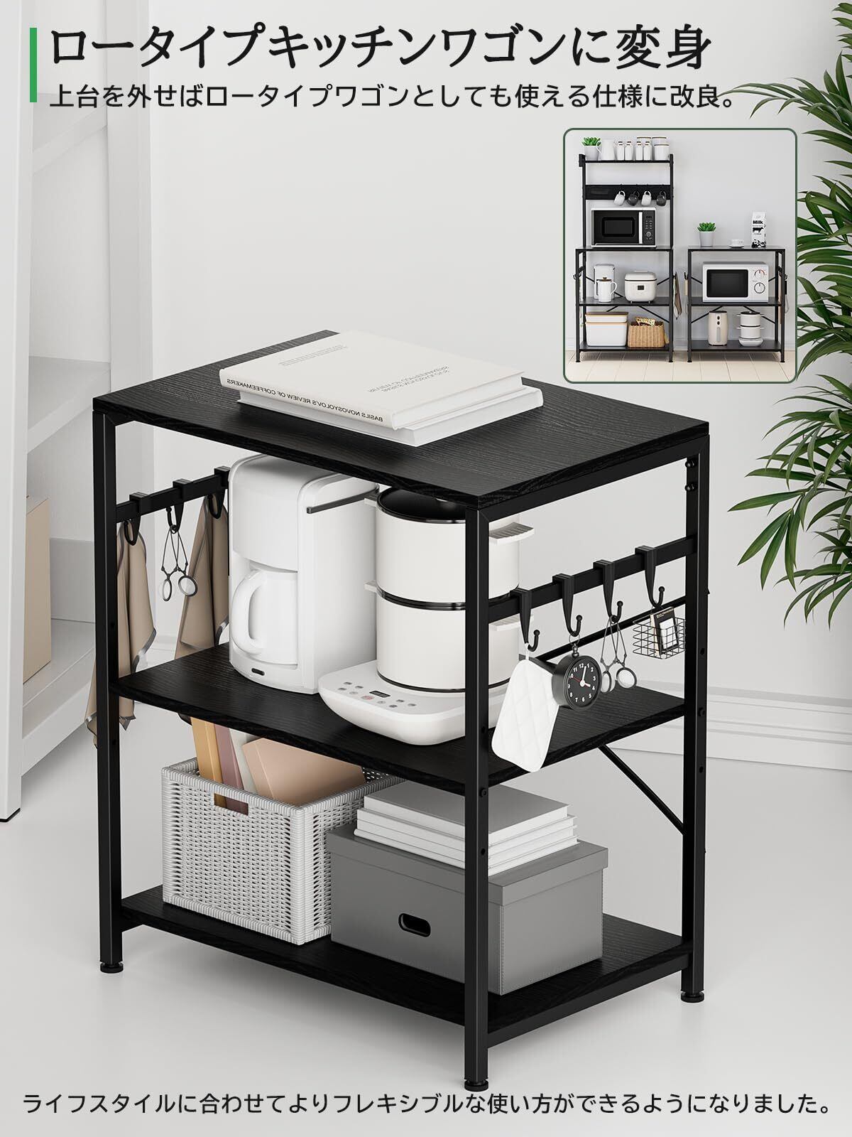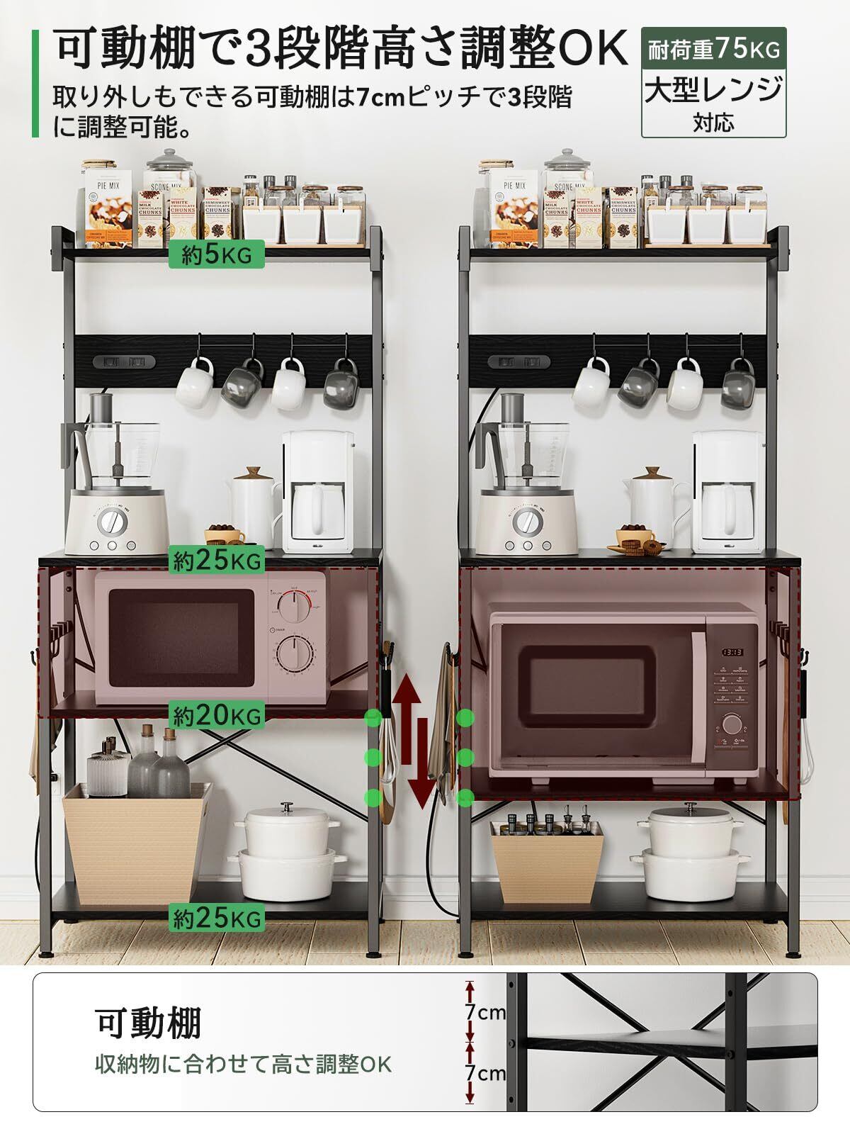 TTWO レンジ台 W60×D42×H130cm レンジラック 2口コンセント付き キッチンラック 可動棚高さ3段調整 レンジボード キッチンボード 食器棚 大型レンジ対応 スリム キッチン収納 耐荷重60kg 省スペース 頑丈 北欧 おしゃれ キッチンキャビネット レンジ置き台 フック付き (ブラック)