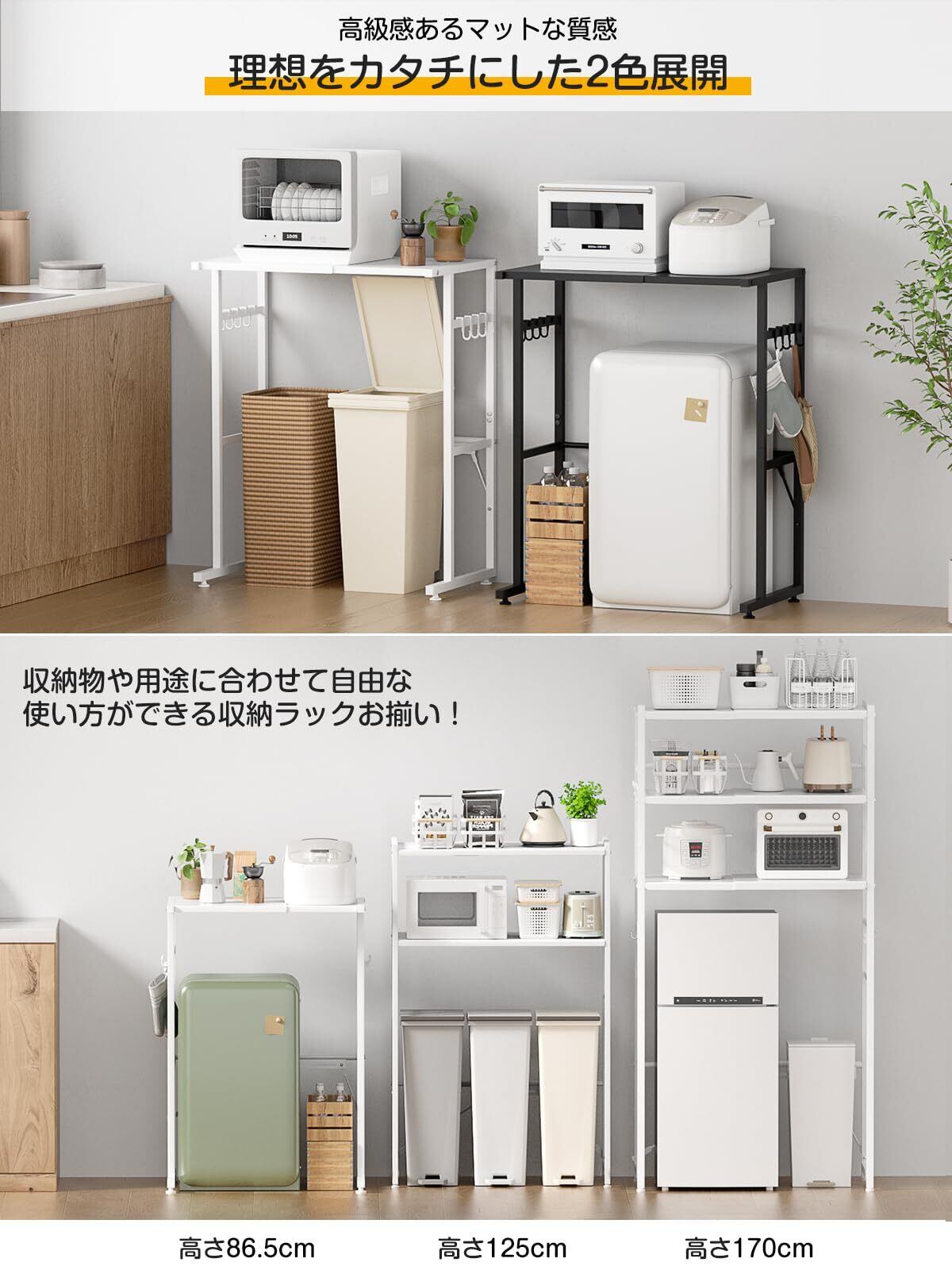 【安定感がある高耐荷重40KG】リニューアルモデル新登場!棚板や構造と耐荷重を改良し、頑丈設計のメタルラックです。荷重能力が強いので、大型電子レンジや工事不要タイプの食洗機を置くのにもおすすめ。奥行き46cmのゆったりサイズなのでレンジ、電気ポットや鍋などをたっぷり収納可能です。ノンフライヤー・炊飯器・豆乳メーカー・電気ケトル ・コーヒーメーカーなどのキッチン電器やキッチン用品を含む多くの物が置けるラック。背板がないので、配線コードの整理も便利で、邪魔しません。