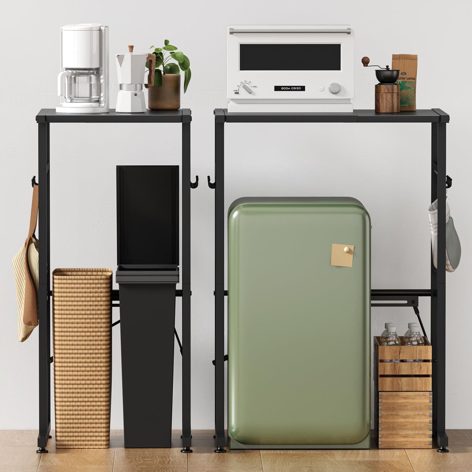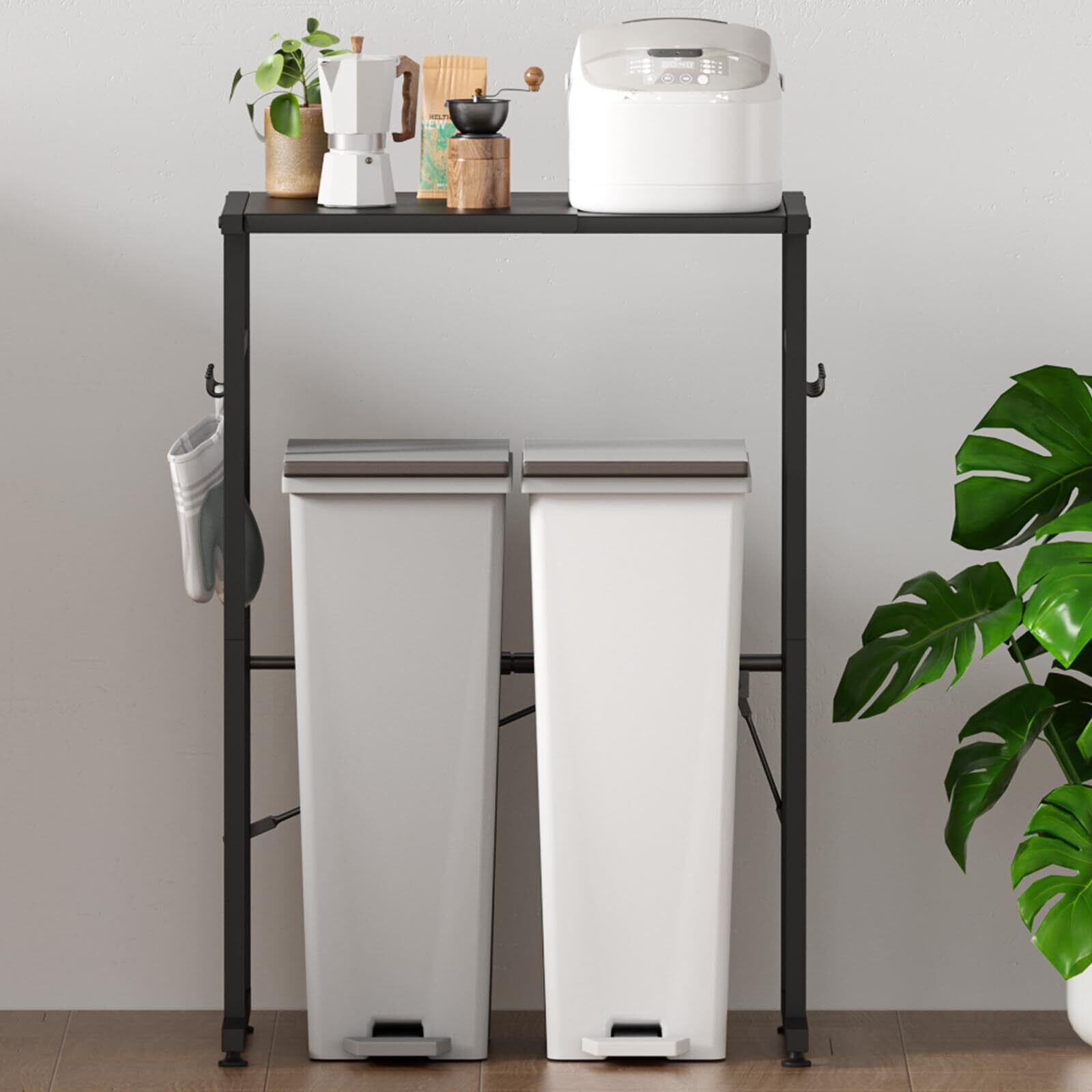 【横幅40~60cm伸縮可能ペダルペール上ラック】空間、収納物に合わせて調節できる無段階伸縮機能ジャストサイズに。広げてお使いいただく場合はトースターとポットなどキッチン家電を並べることができ、狭ると家具の隙間に設置したり、空間にフィットする機能になっています。伸縮式で下に約1~2個のゴミ箱、小型冷蔵庫を置くことができます。スペースに合わせて幅を伸縮できるので作業台横のスペースもムダになりません。