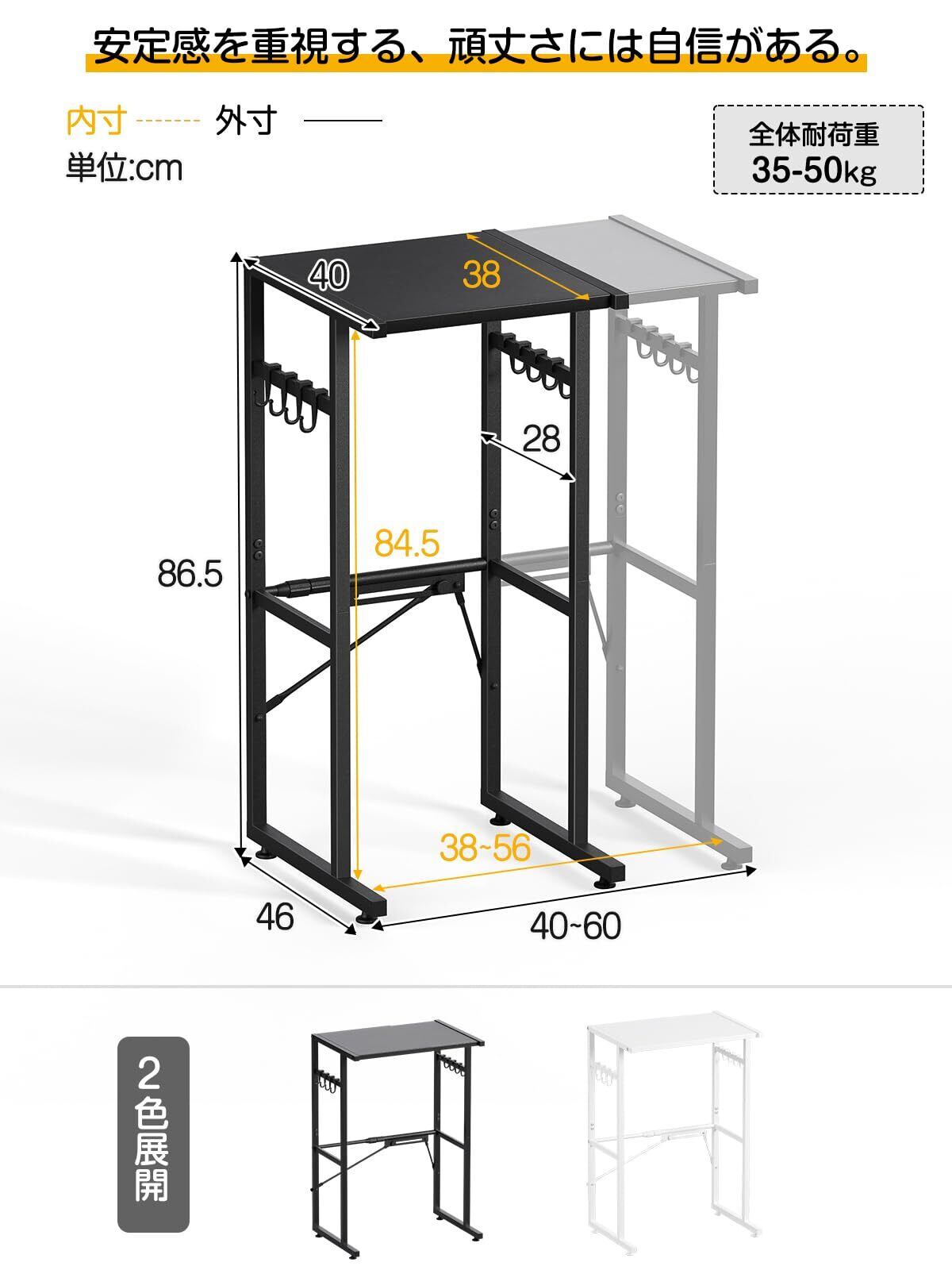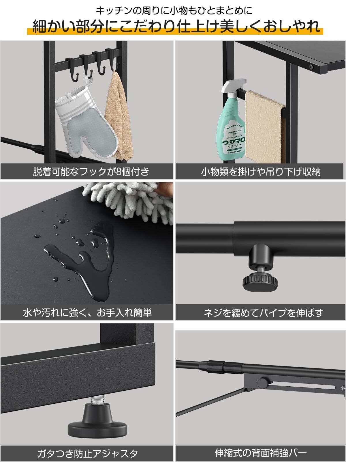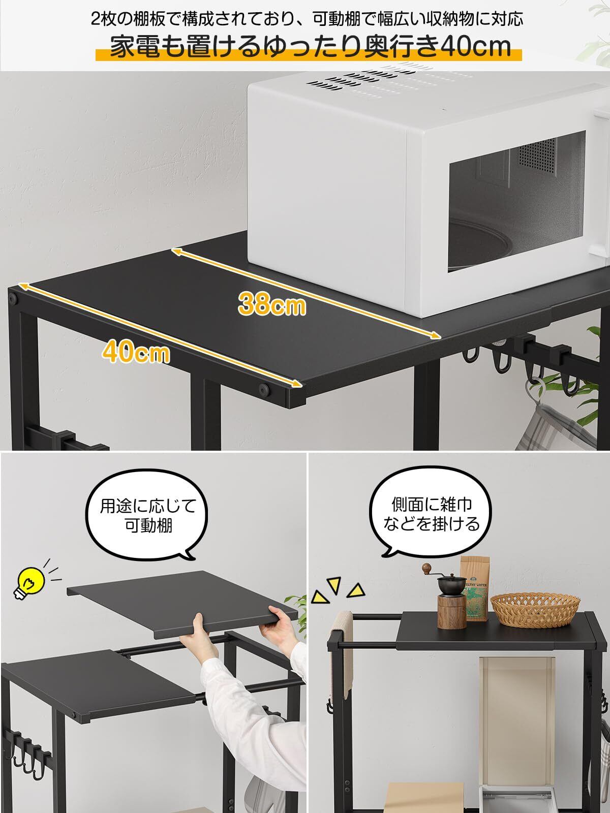 TKUIN ゴミ箱上ラック レンジラック 幅40-60×奥行46×高さ86.5cm 耐荷重40Kg 大型レンジ対応 キッチンラック 作業台 スチール 伸縮式 レンジ台 冷蔵庫上収納 レンジ下収納 ダストペール上ラック ダストボックスラック フック8個付 (Black)