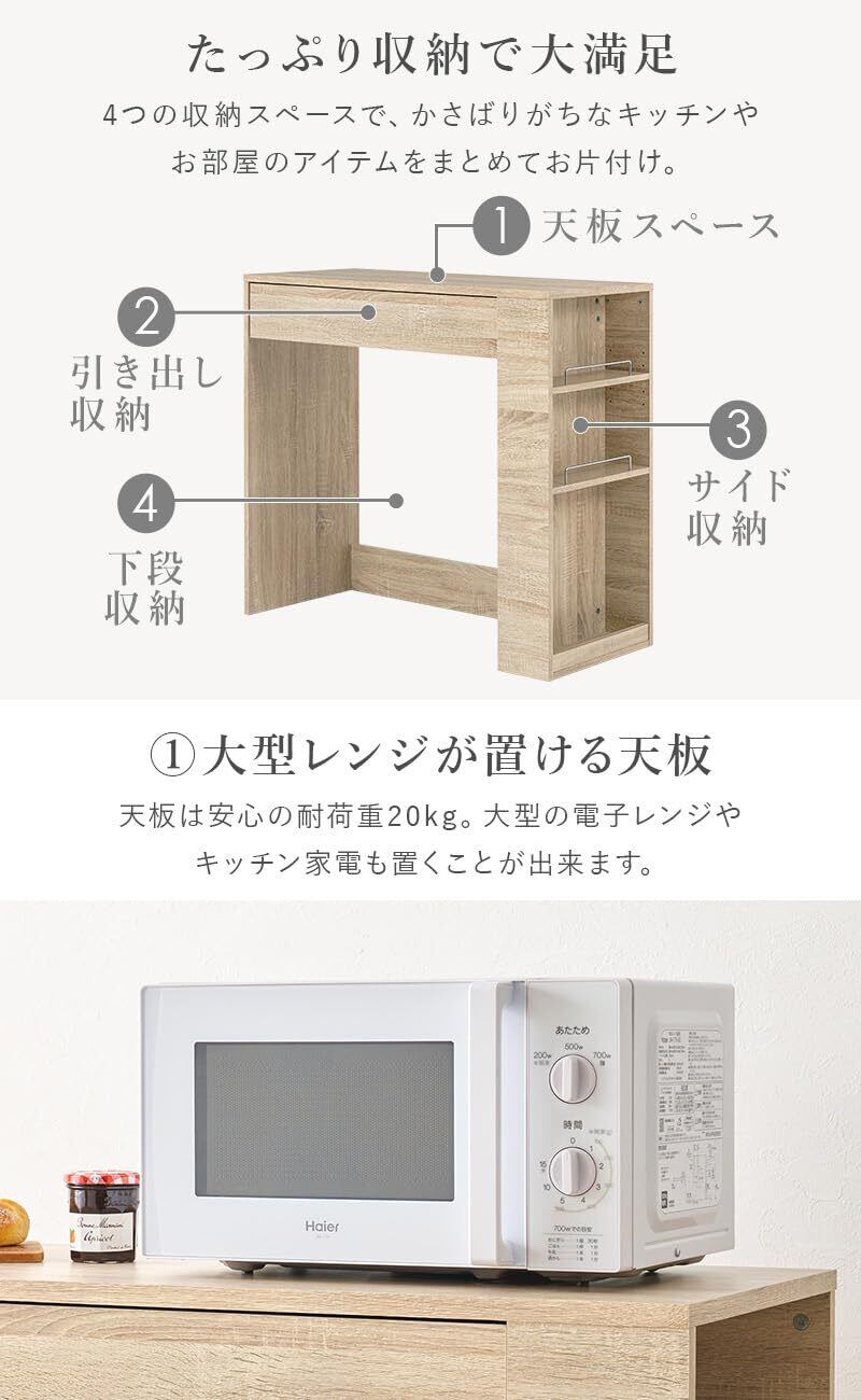 コンパクトながらたっぷり収納できます。天板には大型レンジが置けて、ちょっとした作業スペースにも。