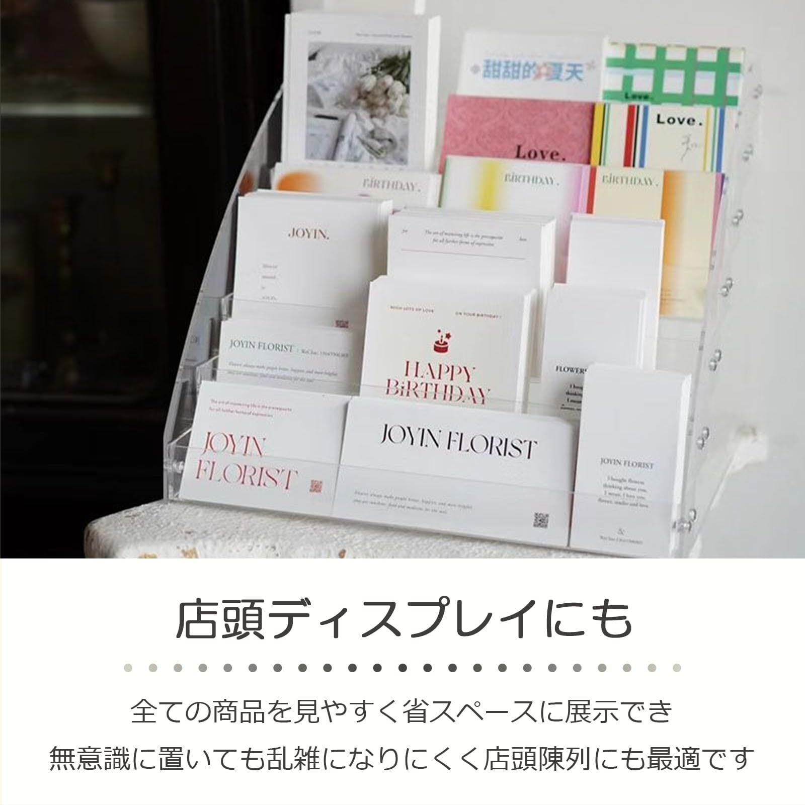 【店頭ディスプレイにも】全ての商品を見やすく省スペースに展示でき、無意識に置いても乱雑になりにくく店頭陳列にも最適です。