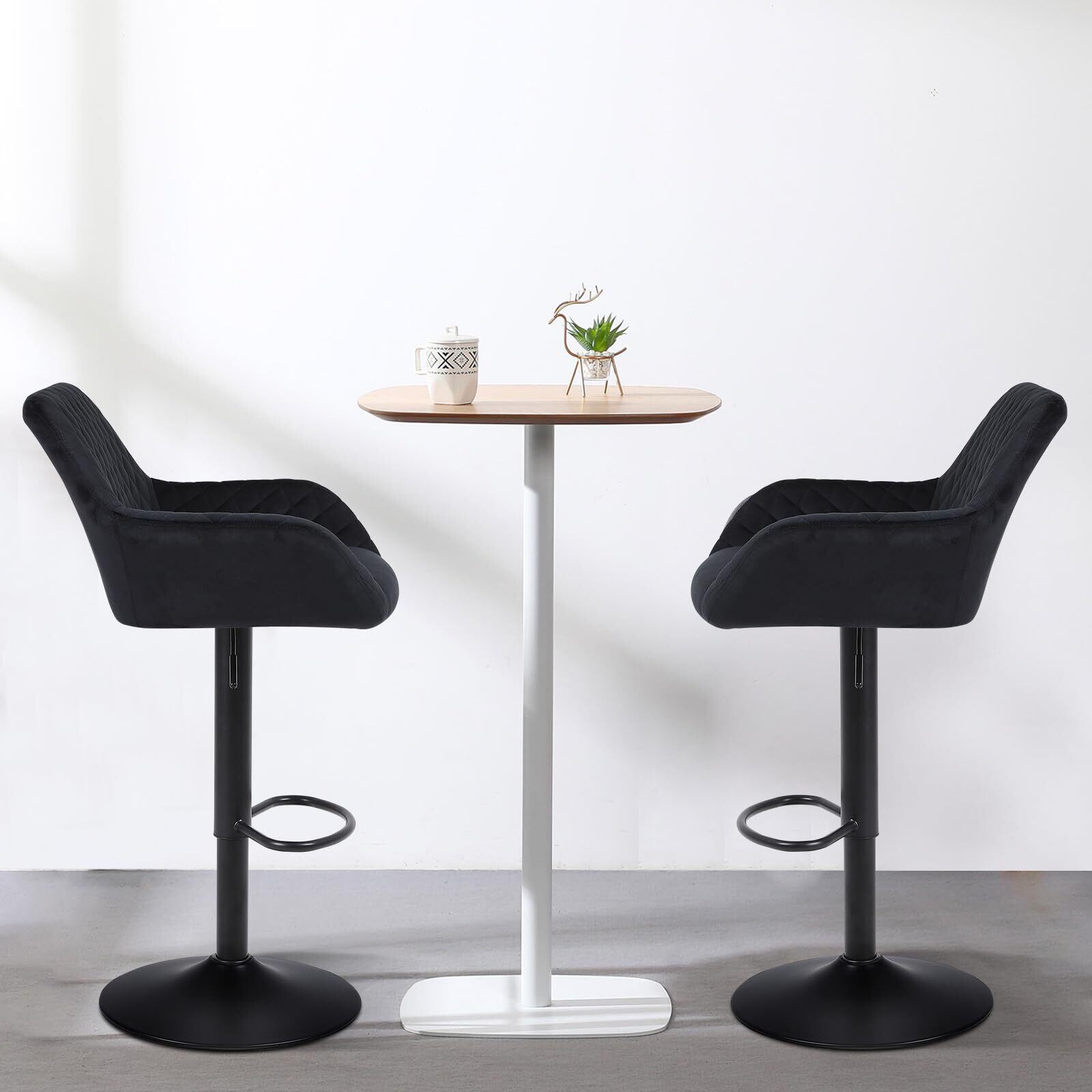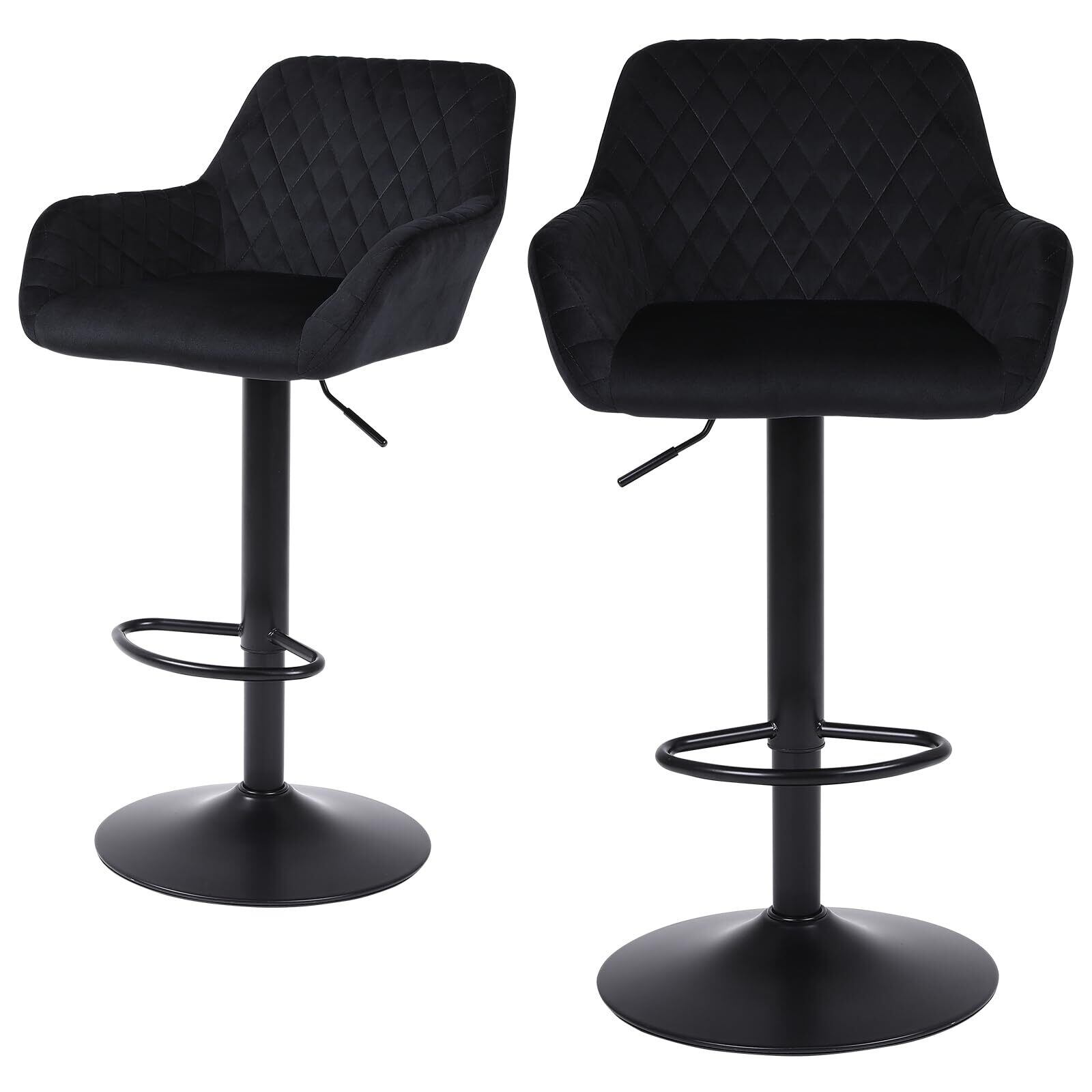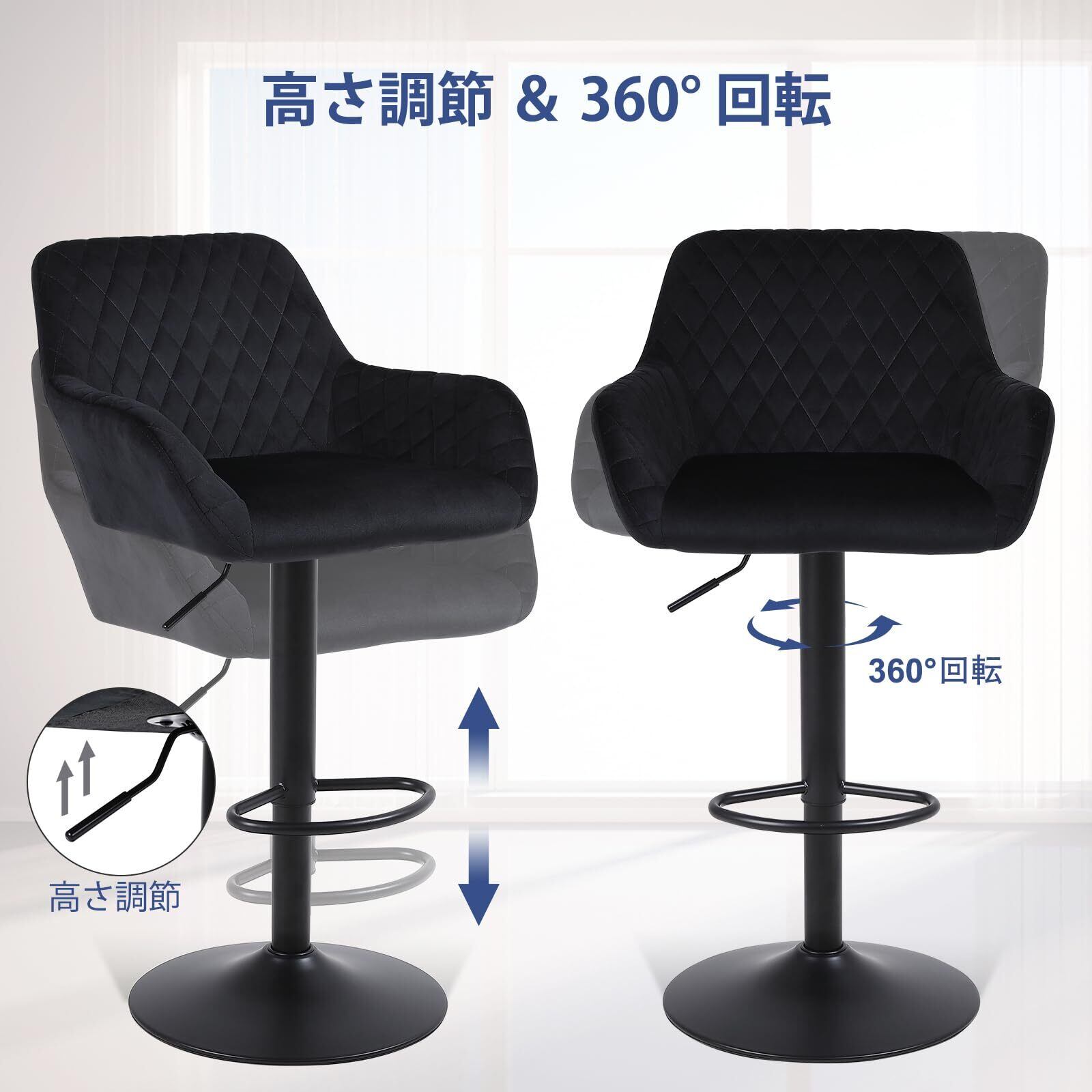 Youhauchair カウンターチェア ベルベット生地 高さ調節可能 回転式バーチェア 背もたれ 肘掛け付き 足置き バースツール バー、カウンター、キッチン用 2脚セット-ブラック