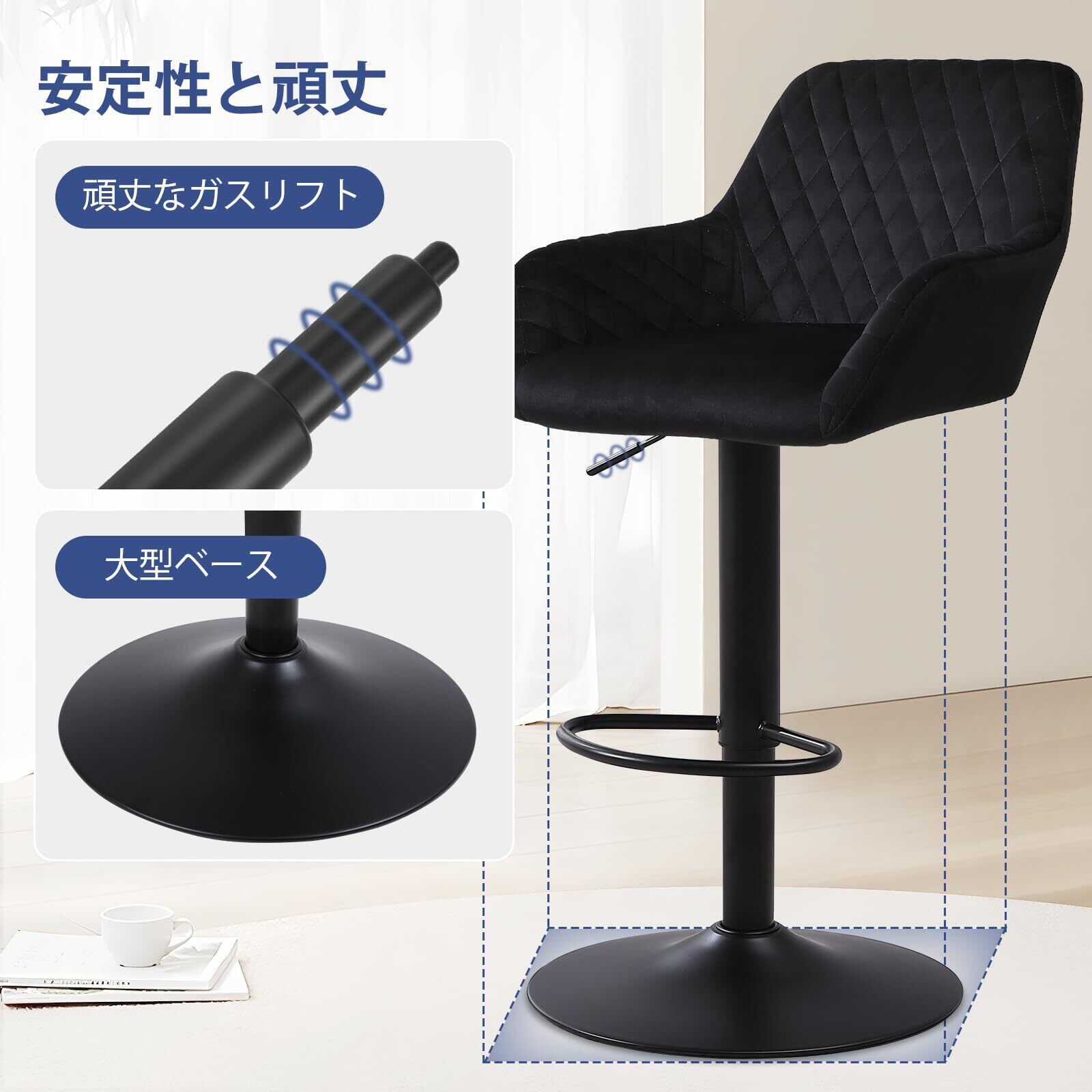 高さ調整可能なバースツール:異なる身長の方や様々な高さのテーブルに対応するため、高さ調節機能を装備。さらに360度回転可能な設計です。広い円形ベースが安定性・耐久性・安全性を完全にします。