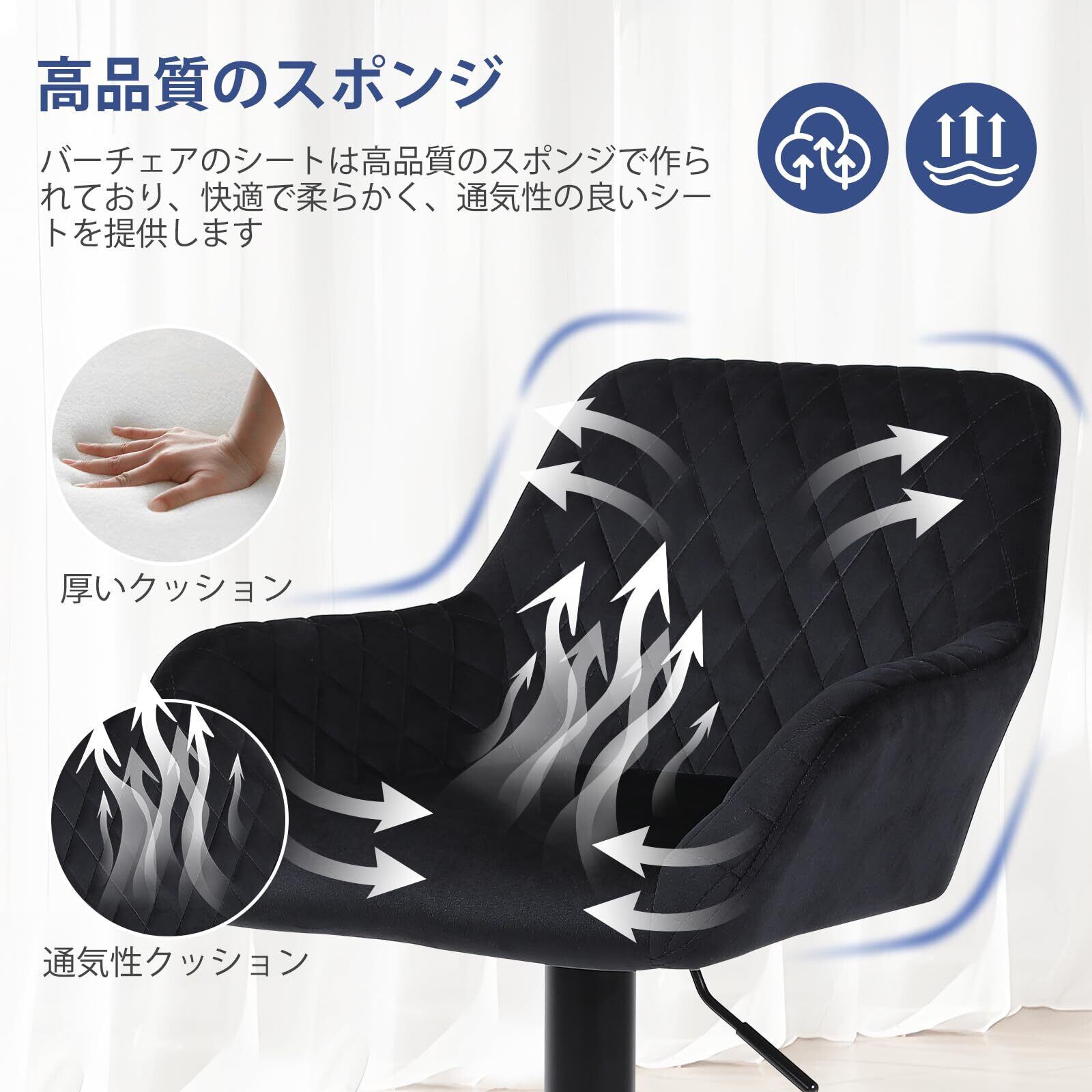 比類なき快適さ:当社の通気性に優れたベルベット生地は、極上の柔らかさと独特の光沢を有します。内蔵されたシワ防止加工と優れた耐久性を備え、バースツールの座面は高密度フォームで構成され、心地よい座感を提供します。中央部の背もたれは腰をしっかり支えます。