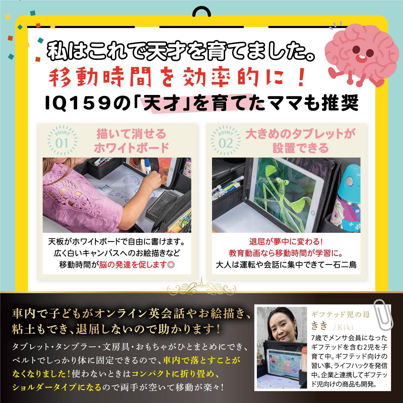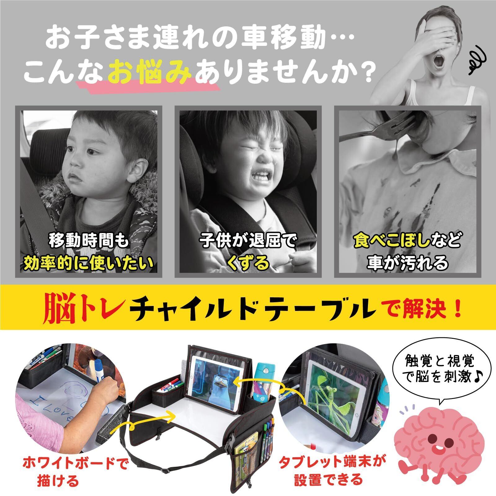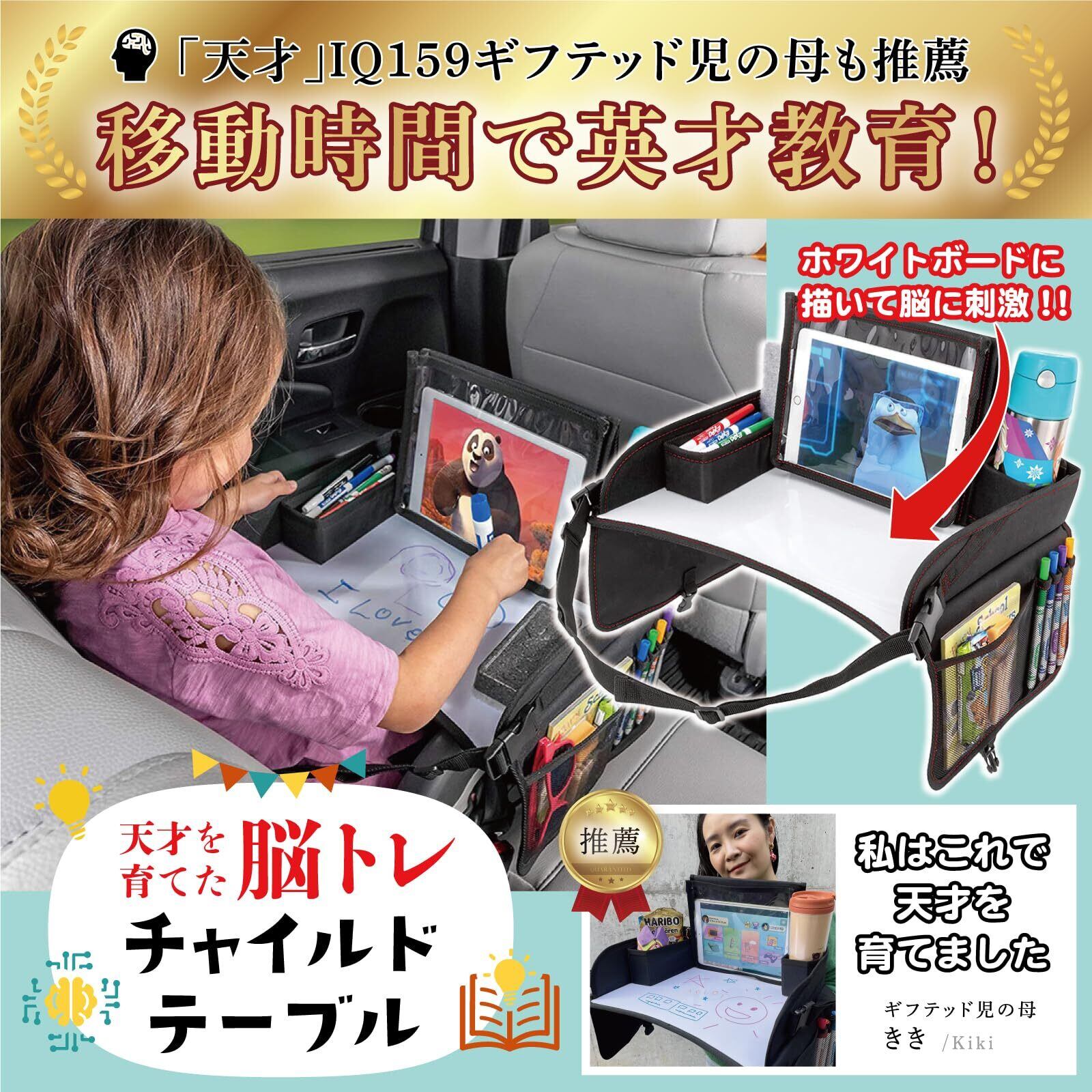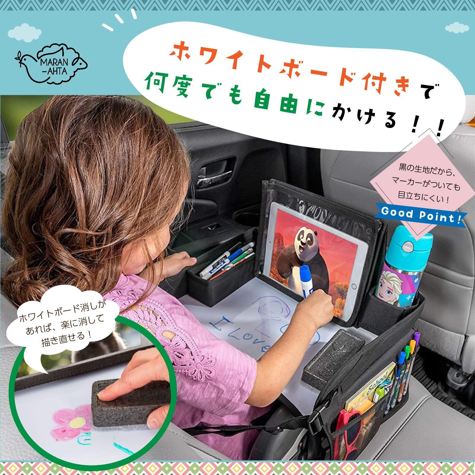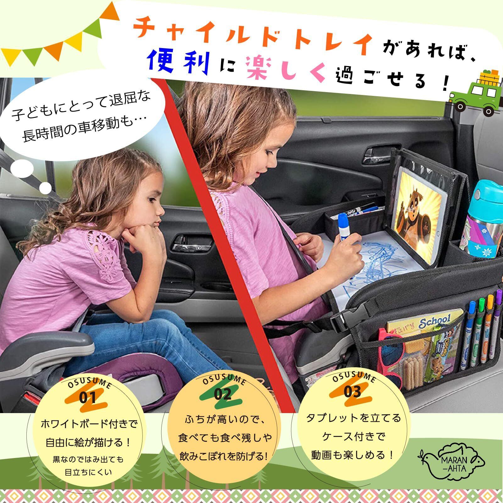 【チャイルドトレイテーブル】 長距離でお出かけの時に、お子様がお絵かきをしたり、おもちゃで遊んだり、タブレットを見たり、お食事等、楽しく車内での時間を過ごすことができ、とても便利な商品です。