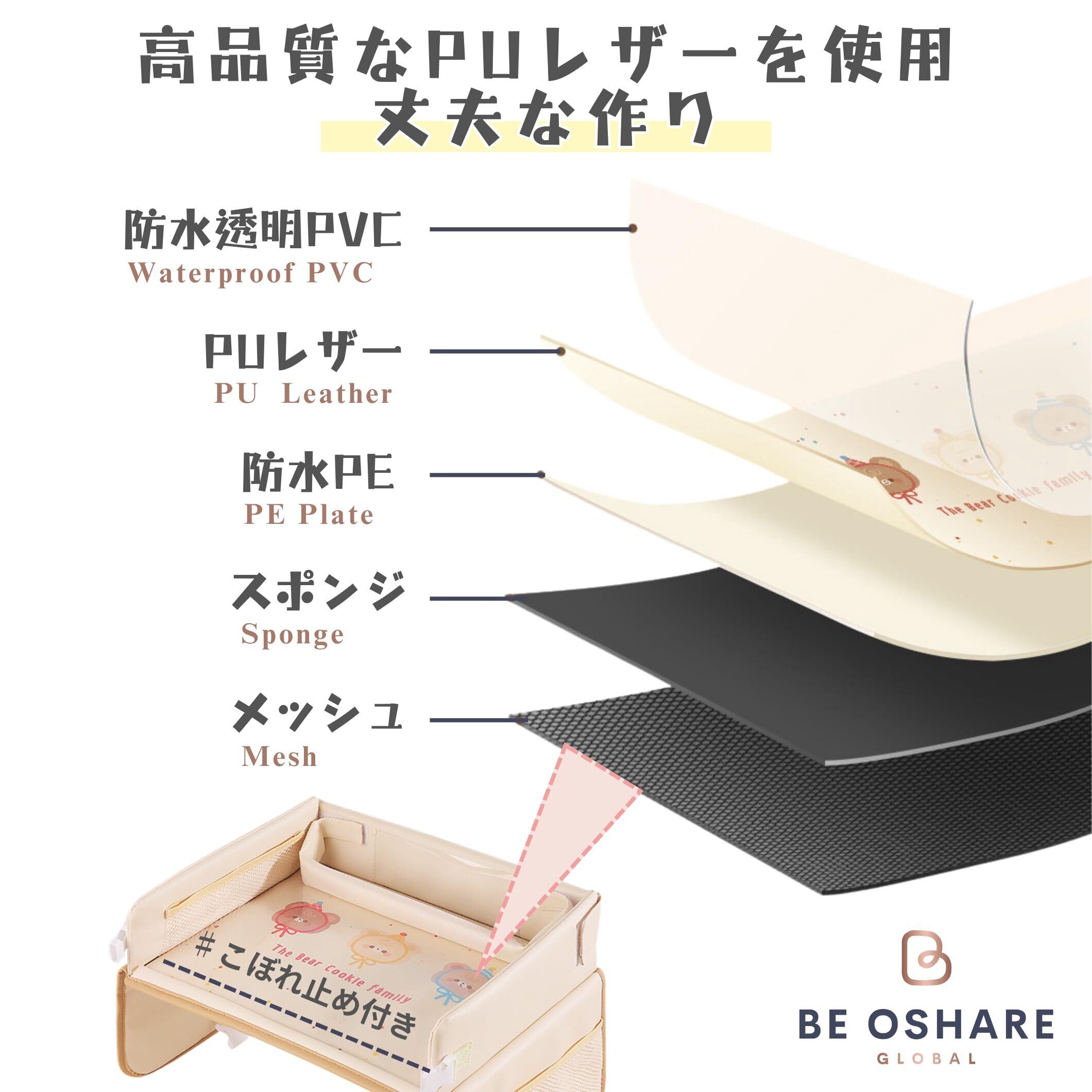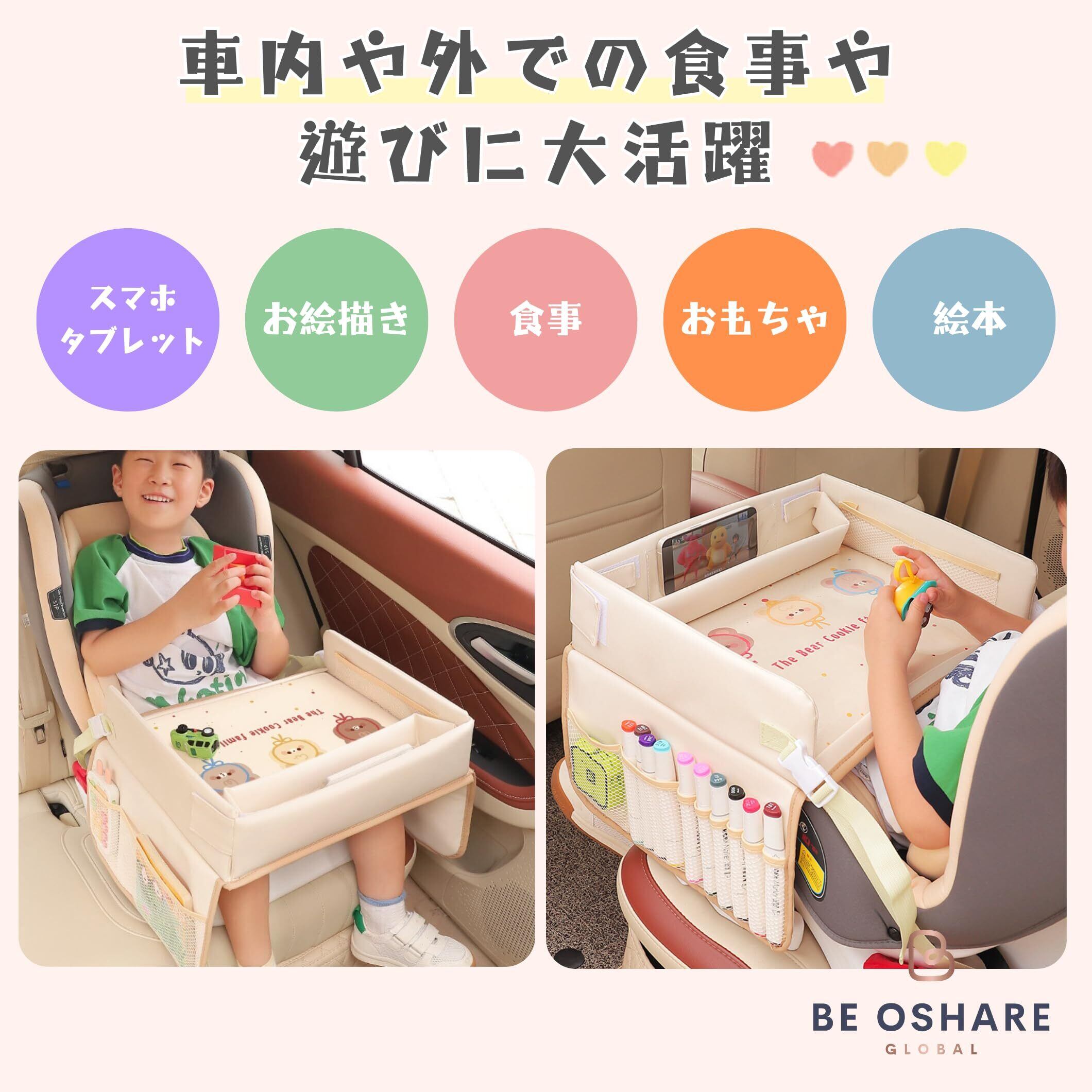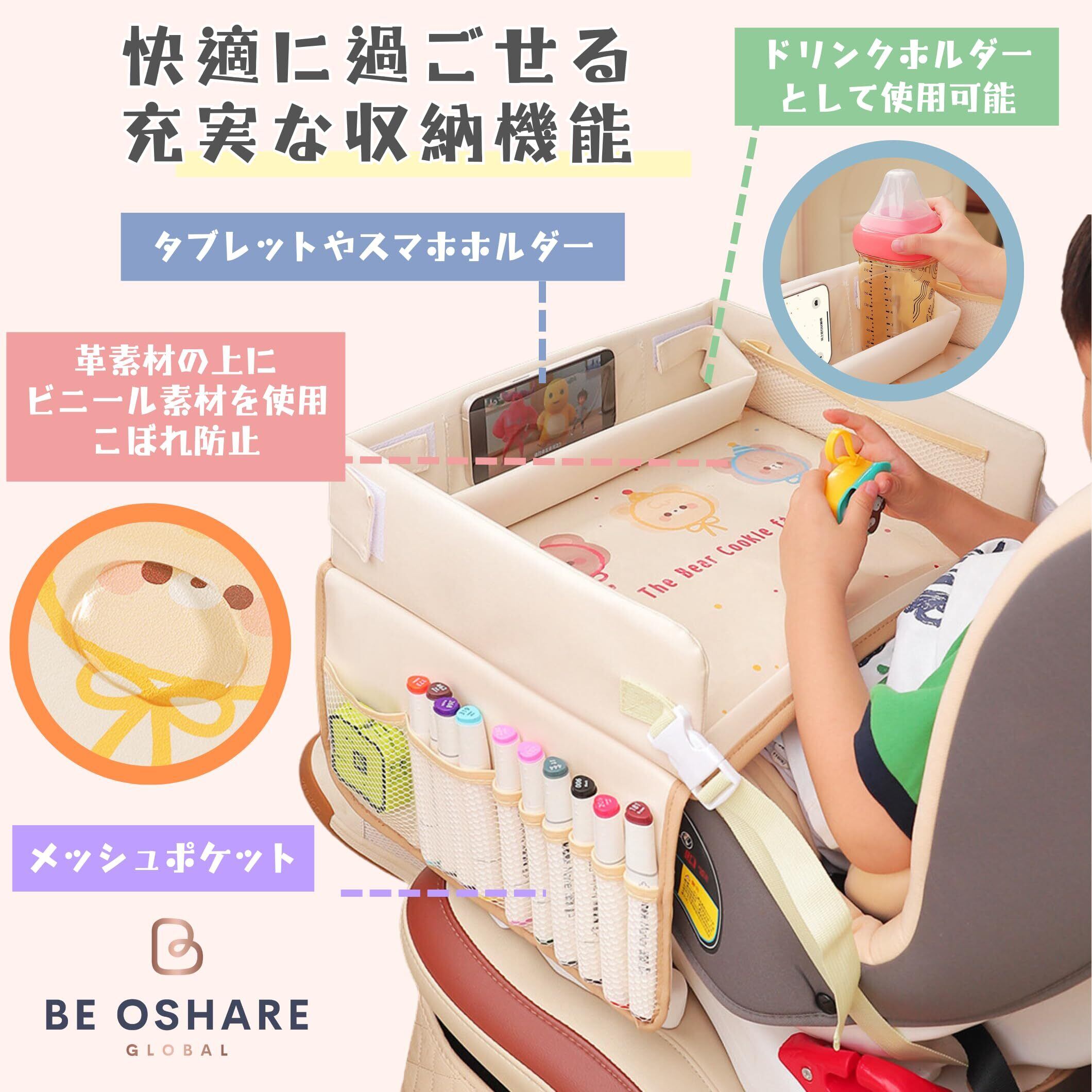 Be Oshare チャイルドシート 革製 車キッズテーブル チャイルドトレイ チャイルドデスク 後部座席 折りたたみ式 長距離移動 タブレットスタンド 塗り絵 おもちゃ 収納 車 子供机 ベビーカー 男の子 女の子 持ち運びやすい 日本販売店 日本語取扱説明書付き (ピンク)