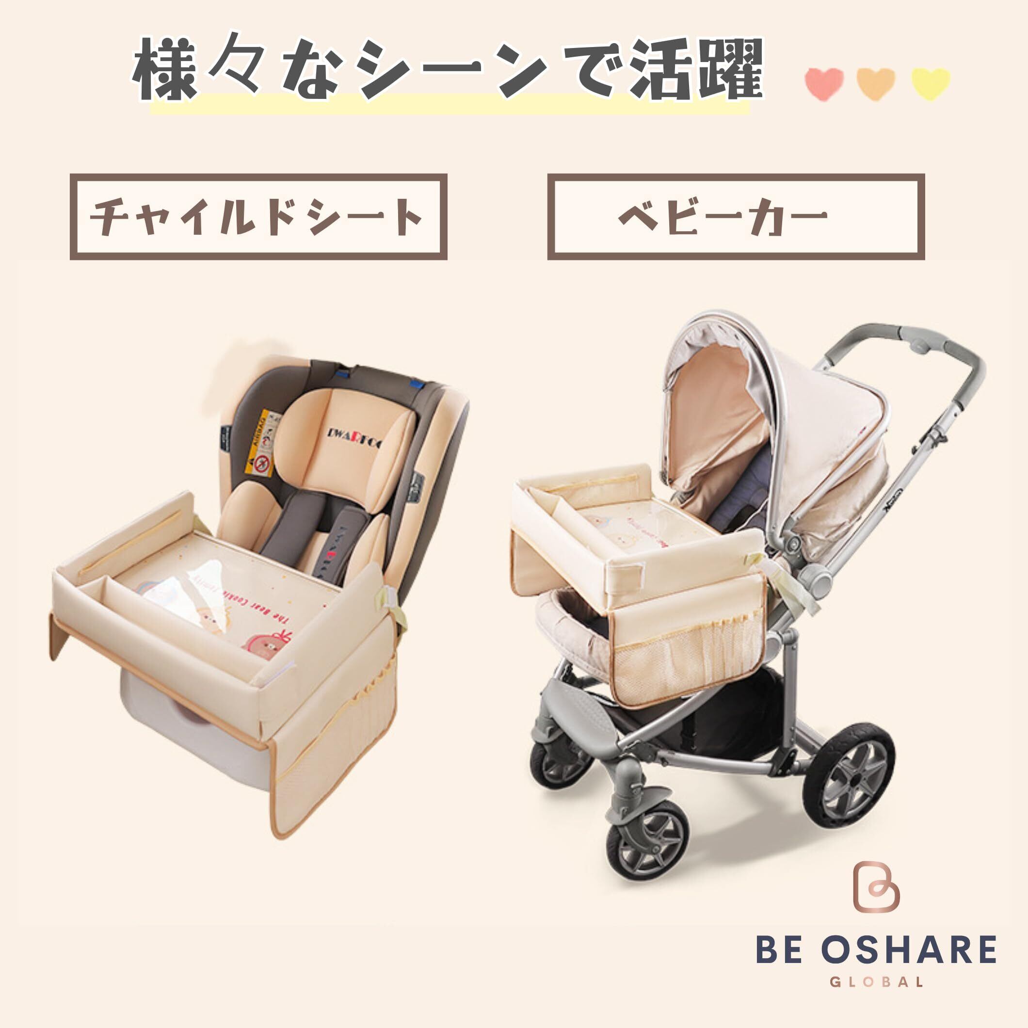 【多機能】携帯しやすく取り付けも簡単。お子さまの腰や車のシートにぴったりとフィットするデザインで、柔らかいフォームトレイが怪我のリスクを防ぎます。豊富な収納ポケットがあり、おもちゃや本、お菓子、ドリンクなどを整理して収納できます。