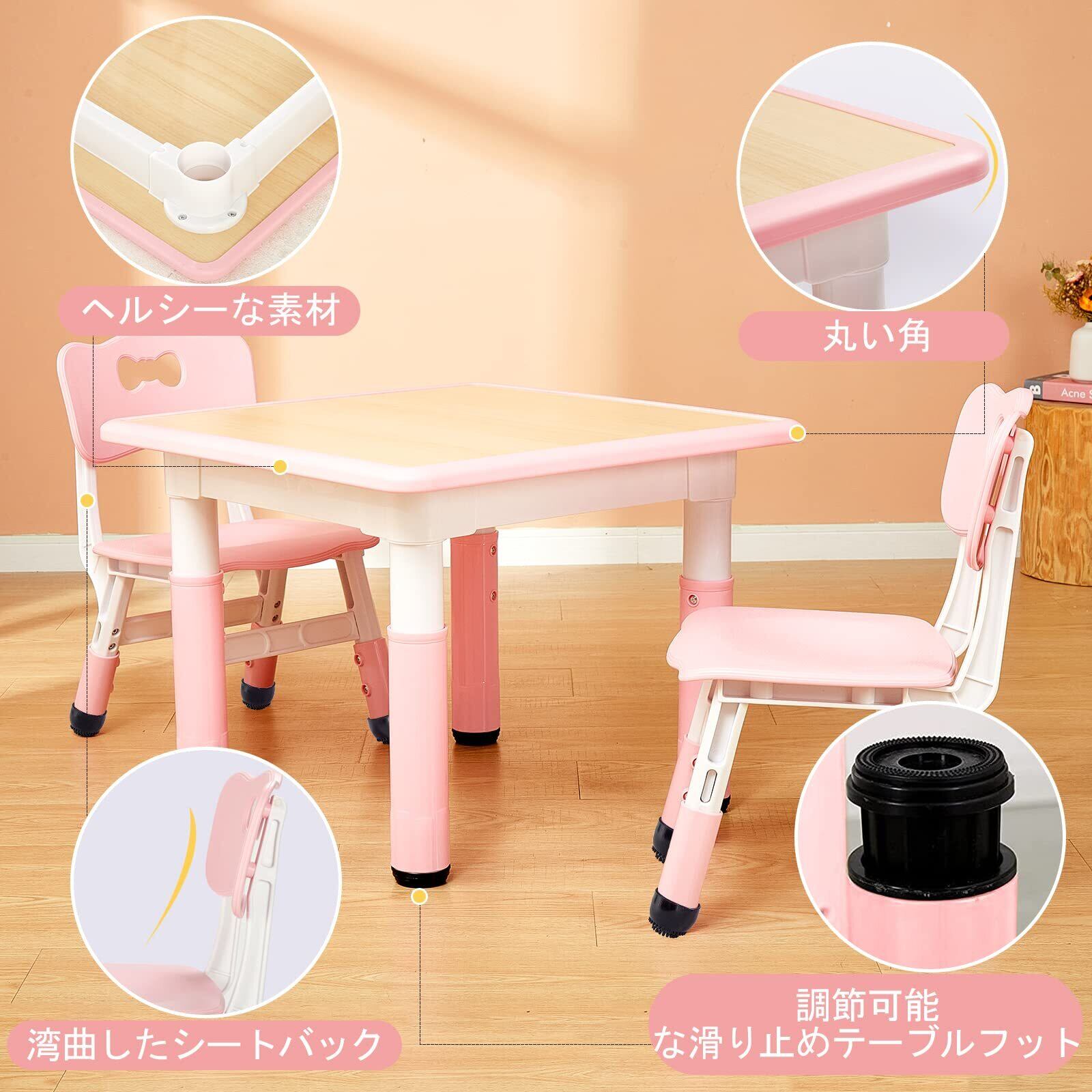 FUNLIO キッズテーブルと椅子2脚セット 高さ調節可能な子供用テーブルとチェアセット 3~8歳用 拭きやすい 学習/絵かき/ダイニング 教室/保育園/家庭用 CPC&CE承認済み (3点セット)ピンク