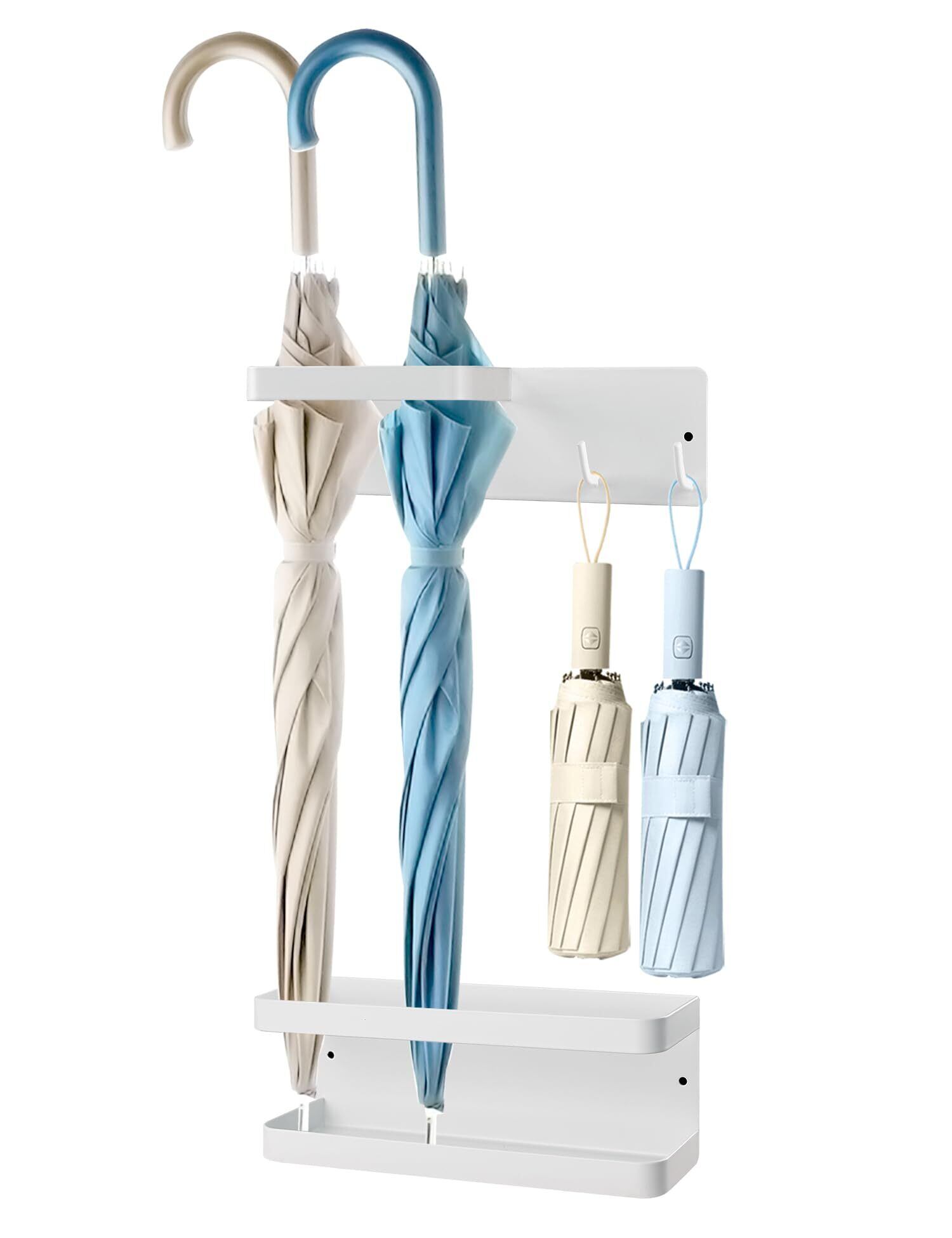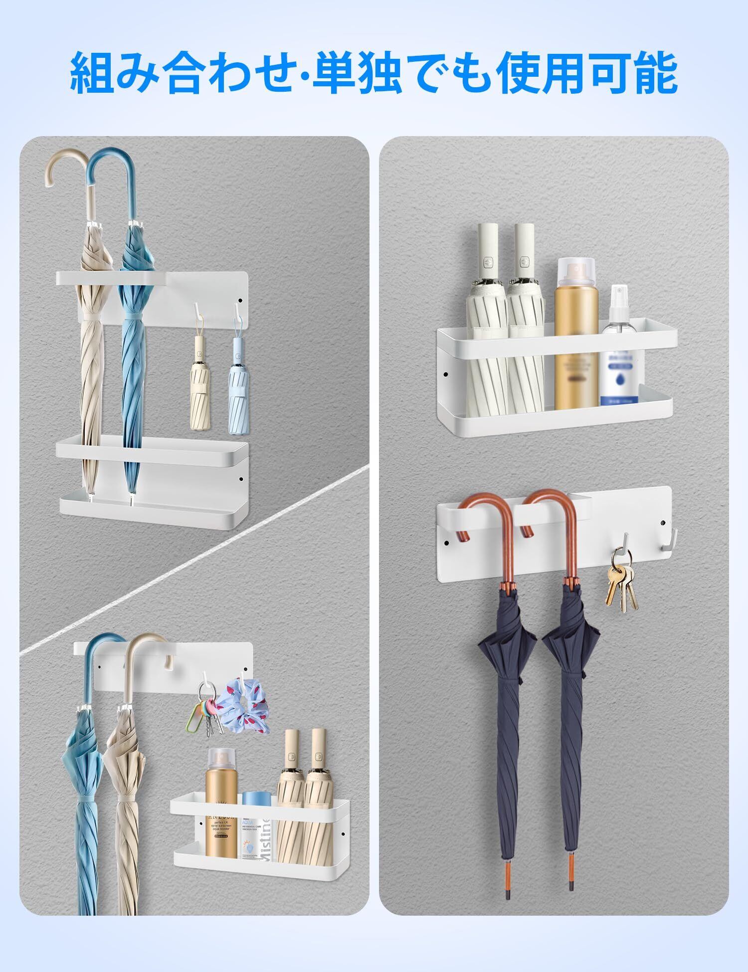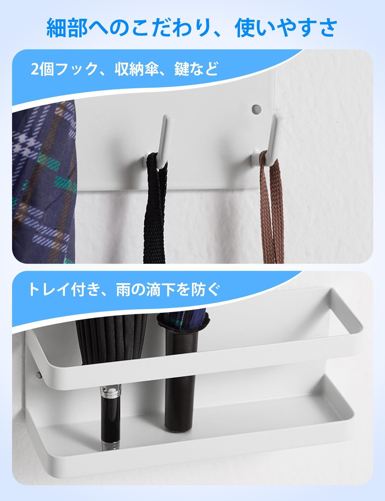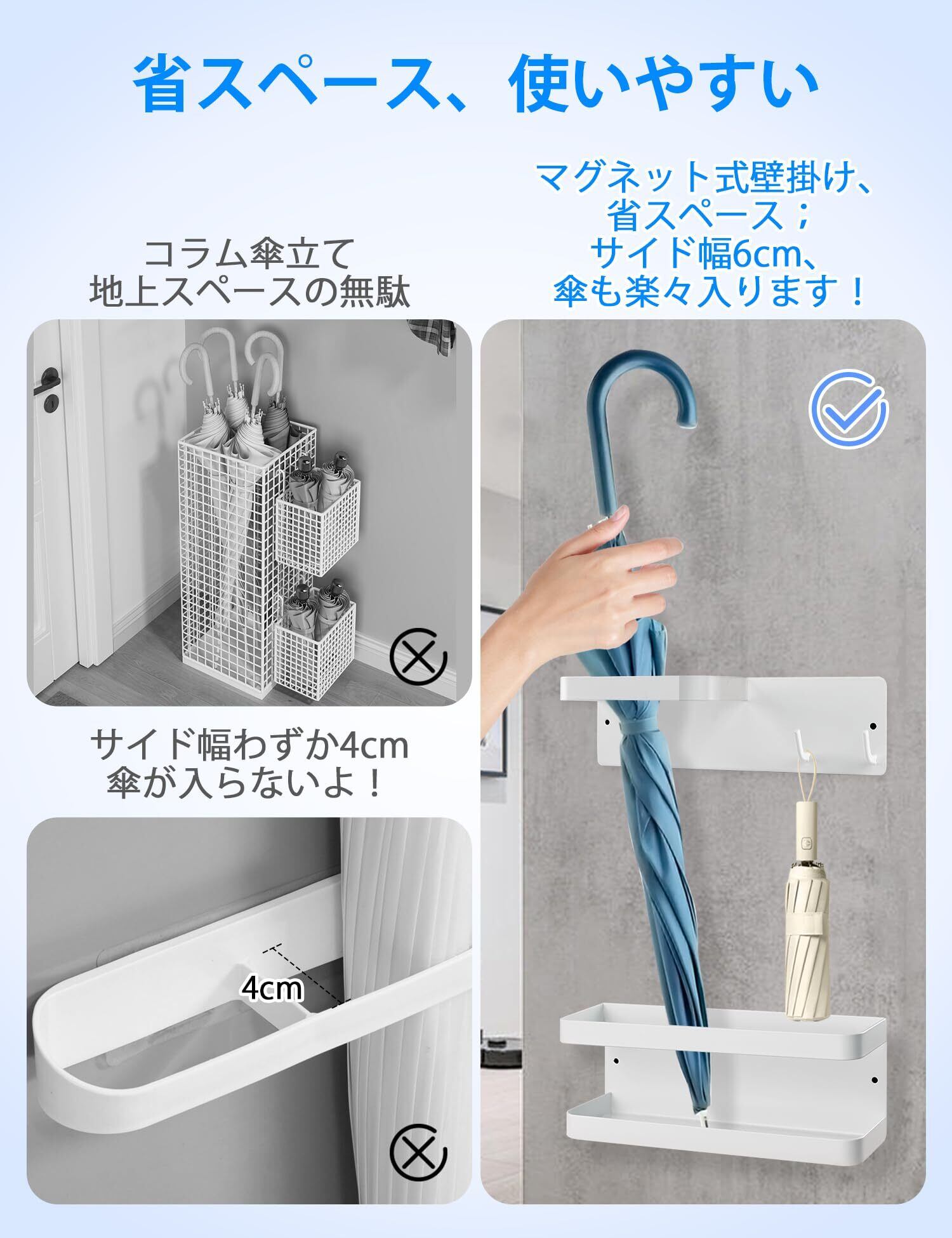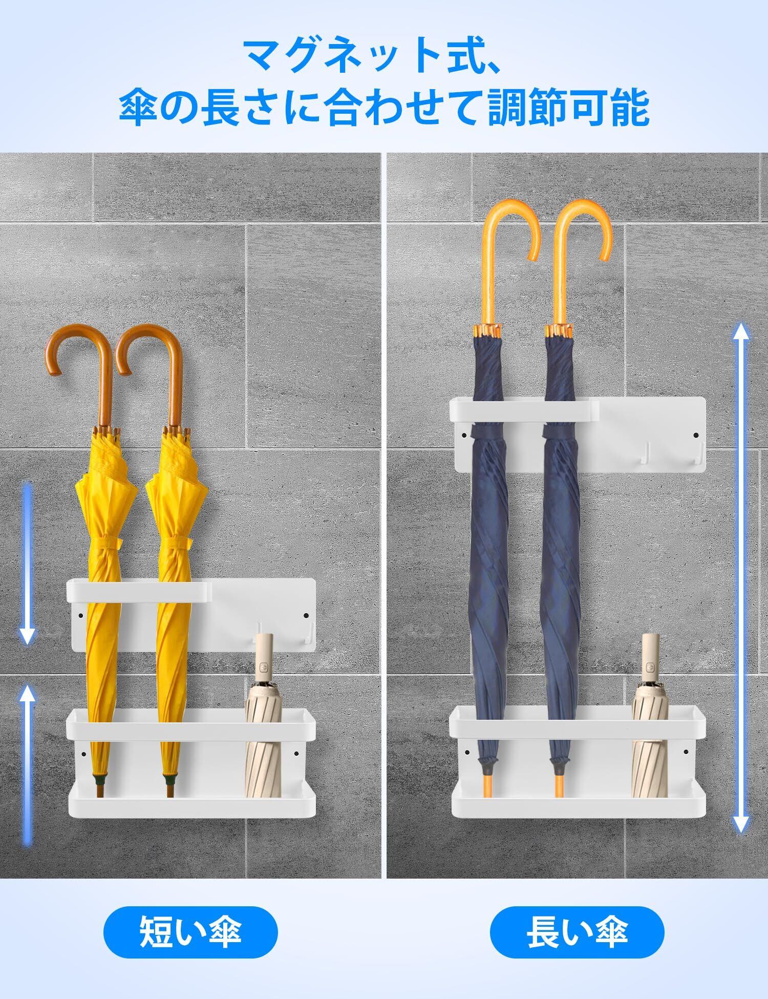 マグネット 傘立て 壁掛け アンブレラスタンド スリム 傘たて フック付き 小物収納 傘置き スマート 傘かけ 高さ調節可能 傘掛け コンパクト かさラック トレー付き 雨水収集 多機能傘収納 雨季 玄関/扉/屋外/キッチン/浴室収納(ホワイト)