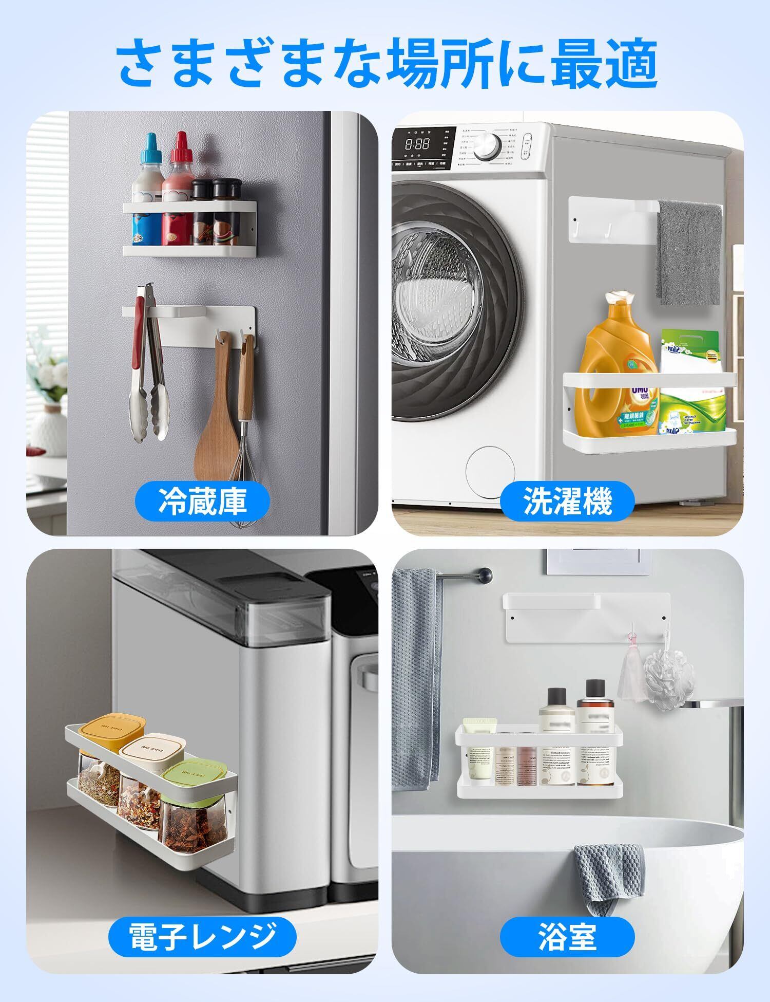 【マグネット式】 本製品の背面には強力な磁石が付いており、磁石のある場所であればどこにでも設置できます。玄関に設置し、傘やマスク、鍵などを収納できます。冷蔵庫や電子レンジの横に設置して、スパイスボトルや調味料ボトル、飲み物などを収納することもできます
