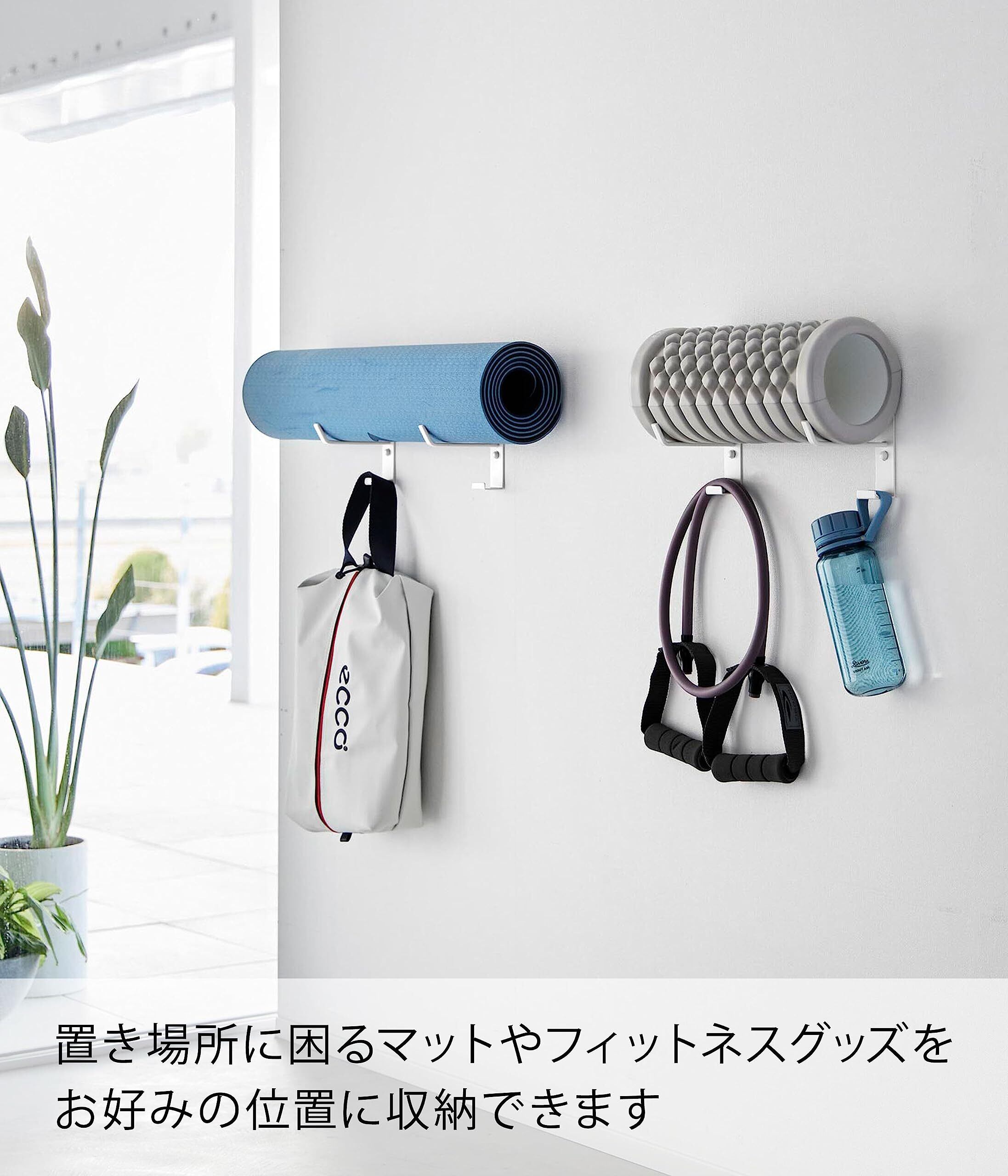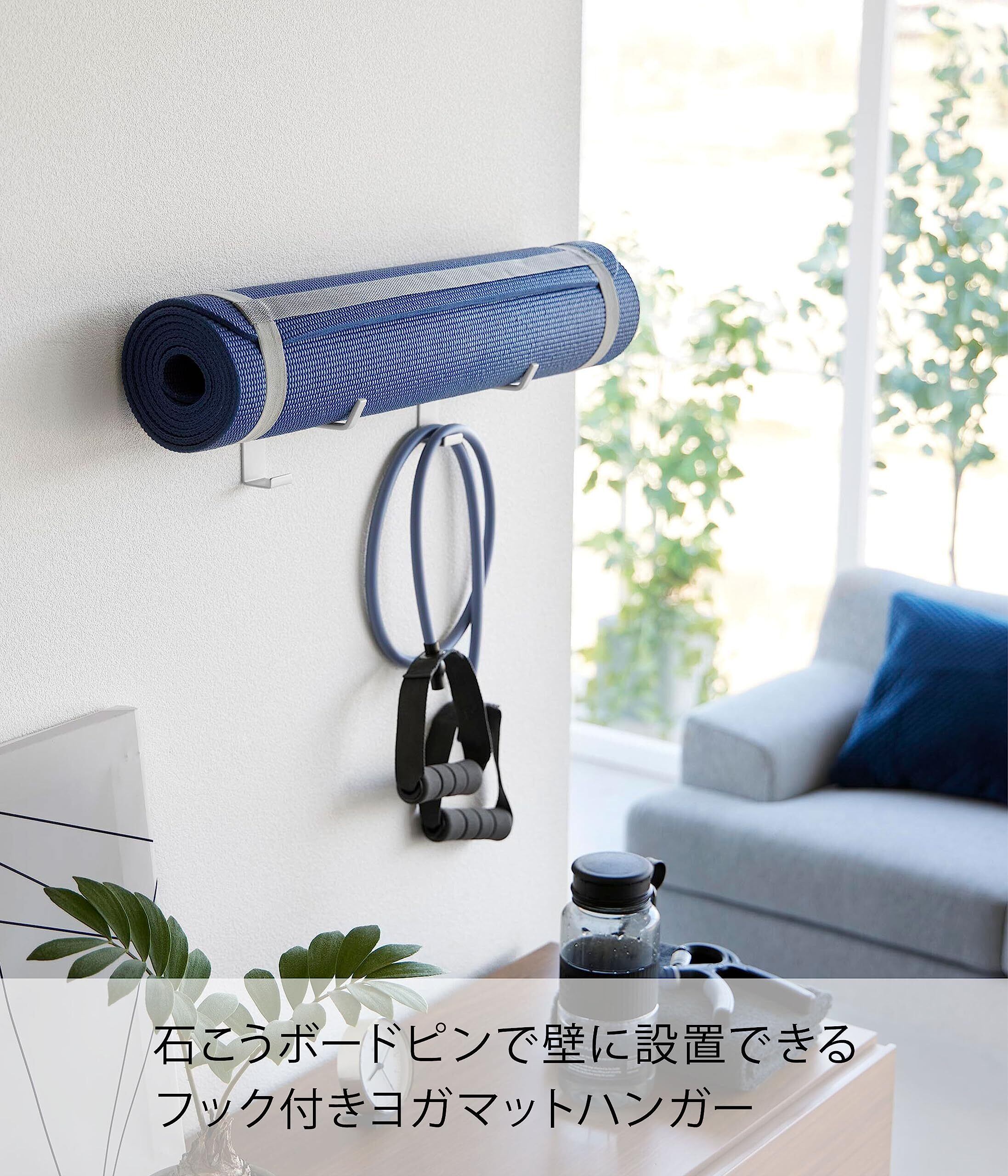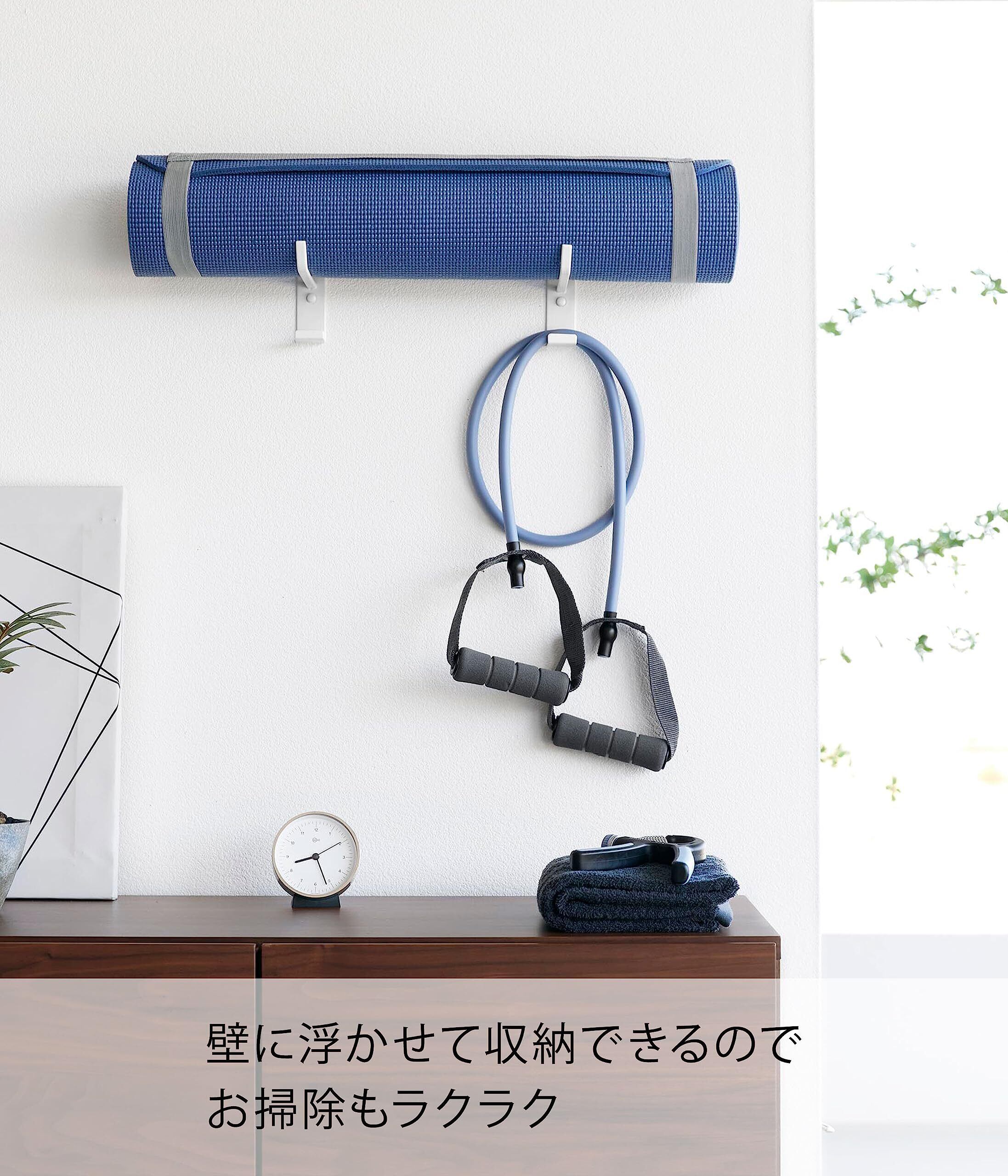 置き場所に困るヨガマットやフィットネスグッズを壁に収納!石こうボードピンで設置できるフック付きヨガマットハンガー。