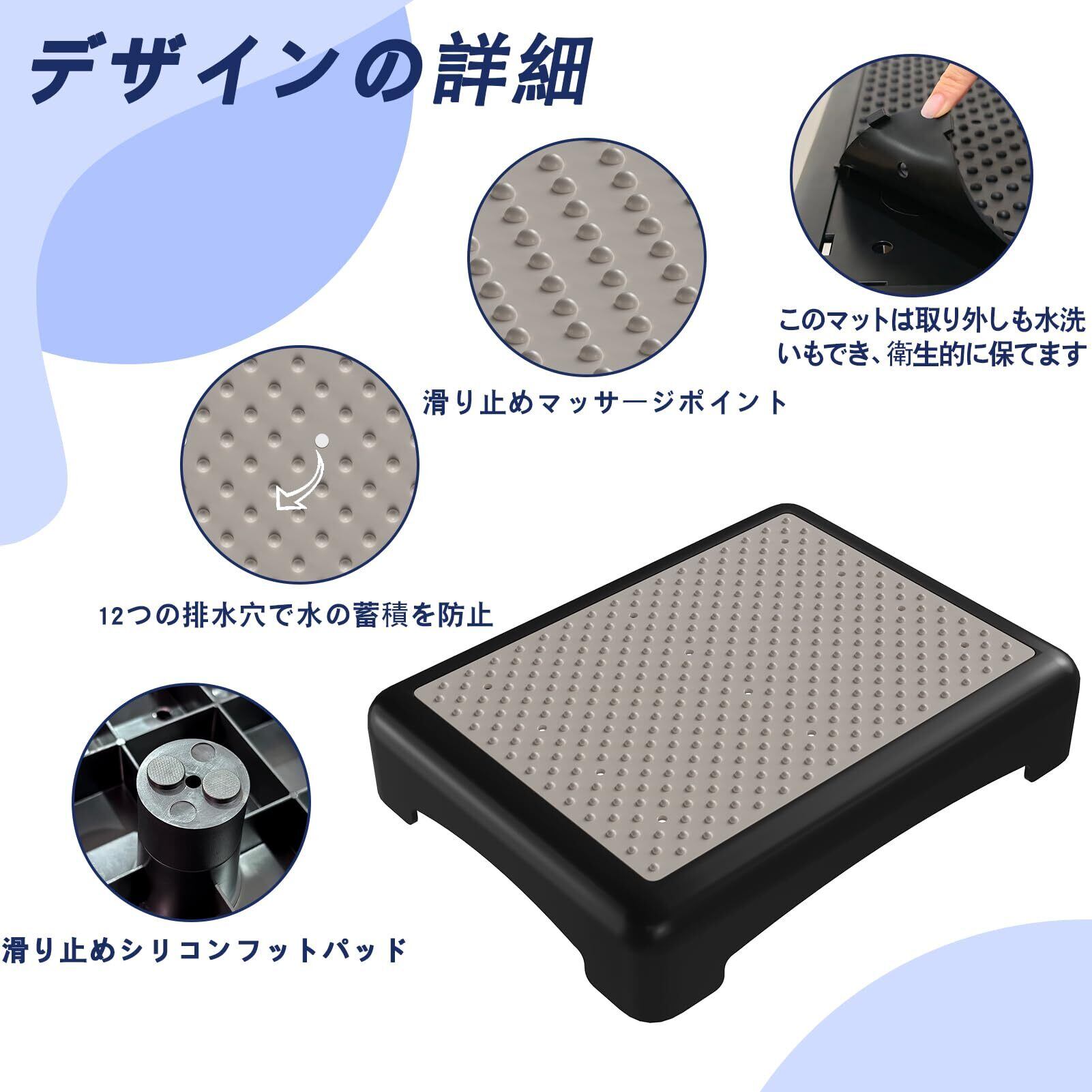【特殊防滑+排水設計 - 雨天でも安心なステップパッド】表面に12個の排水穴を配置(水たまり防止)+底部4箇所滑り止め脚。高摩擦ゴムとプラスチック複合構造で、雨の日/雪道でも確実なグリップ力を実現。 【超耐荷重250kg - 強化プラスチックボディ】軽量プラスチック素材(44×34×9.5cm)ながら建築用補強構造を採用。ご家族・ペット・介護が必要な方まで幅広く対応可能な高強度設計。 【着脱式マッサージゴムパッド - メンテナンス簡単】凸型マッサージボール付きの表面パッドは着脱可能。防滑機能と足裏刺激効果のダブル機能で、健康意識の高い方へおすすめ。 【360度コンパクト収納 - 狭い隙間にもスッキリ】車のトランクはもちろん、玄関クローゼットやベッド下など、あらゆる隙間空間に収納可能。突然の来客時でもサッと出して設置できます。 【ユニバーサル設置システム - 工具不要30秒設置】前後滑動防止ストッパー+側面非滑りクッション付き。軽自動車から大型SUVまで、シート形状を選ばない汎用性の高さが特徴です。