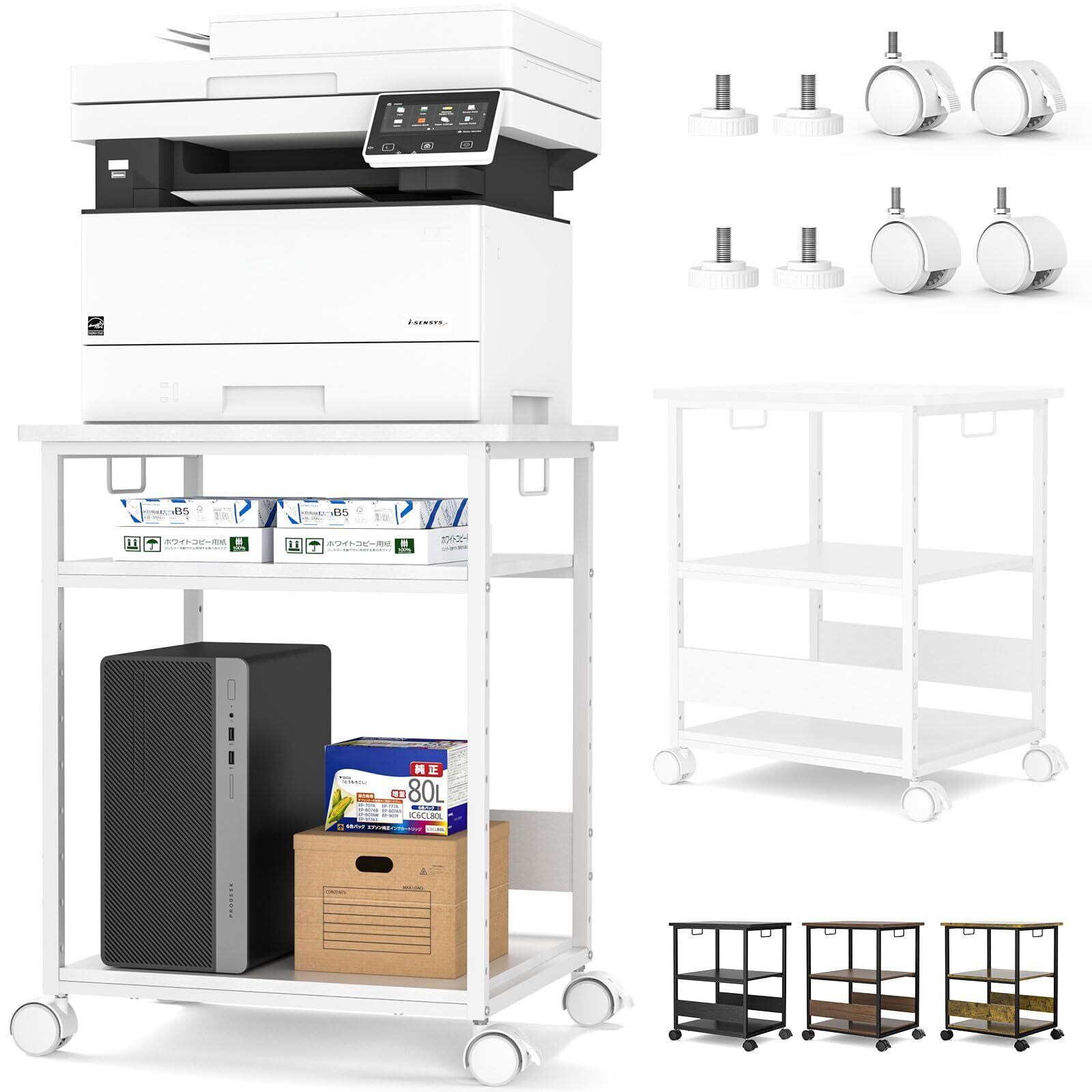 【2タイプの足がつき 】 プリンター台はお客様のご使用シーンに合わせてアジャスターとキャスター両方が両方ついております。アジャスターはガタつきを微調整できます。ロック付きキャスター移動・据え置きに便利です。軽い力で移動させられるので、お掃除も楽にできます。前輪にはストッパーが付いているので使わないときはピタッと固定できます。フローリングを傷つけにくいです。 ※頻繁に移動する場合、キャスターの取付をご推奨いたします。