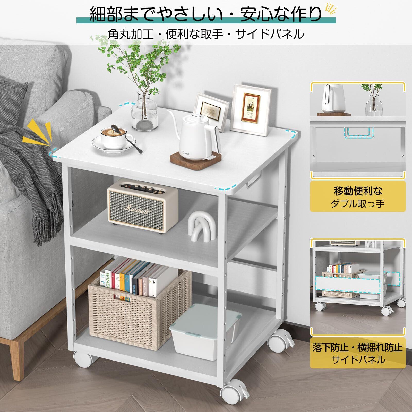 [W60*D50*H70cm]プリンター台 キャスター付き パソコンラック 中棚高さ9段階調節 両側取っ手付き pcワゴン オーディオラック デスク下 収納 棚 木製 袖机 スリム オフィス 収納 オフィスワゴン (ホワイト)