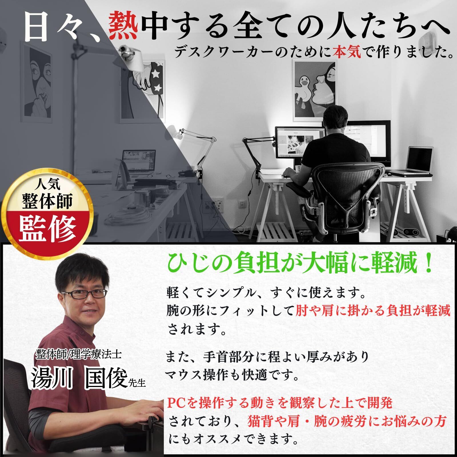 【 整体師が監修した肘に優しい設計 】人気整体師が監修した人間工学に基づいた設計で、肘への負担を大幅軽減。高品質なクッションは腕全体をサポートし、特に肘や手首への負担を和らげます。