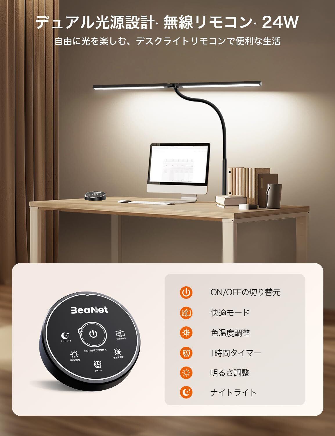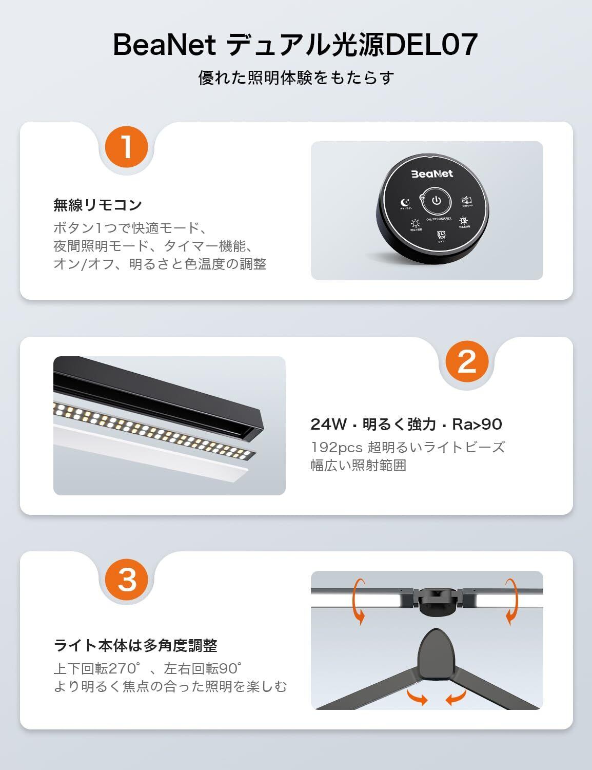 【デュアル光源・24W・超明るい】BeaNet 24W LEDデスクライトは、192個の超高輝度LEDビーズを搭載した独特の2つの光源設計です。明るく強力、幅広い照明がテーブルトップ全体を照らします。同時にライトポールは800mmまで伸ばすことができる、空間全体をに照らします、適切で快適な照明を提供。LEDライトは柔らかく、ストロボなし、ブルーライトなし、多重影なし、あなたの目を保護します。 演色性指數はRa>90、自然光に近い光を照らし、正しい色が見えます。頑丈な金属クリップは最大厚さ55mmのデスクトップをサポー。消費電力:24W [PSE認証済]