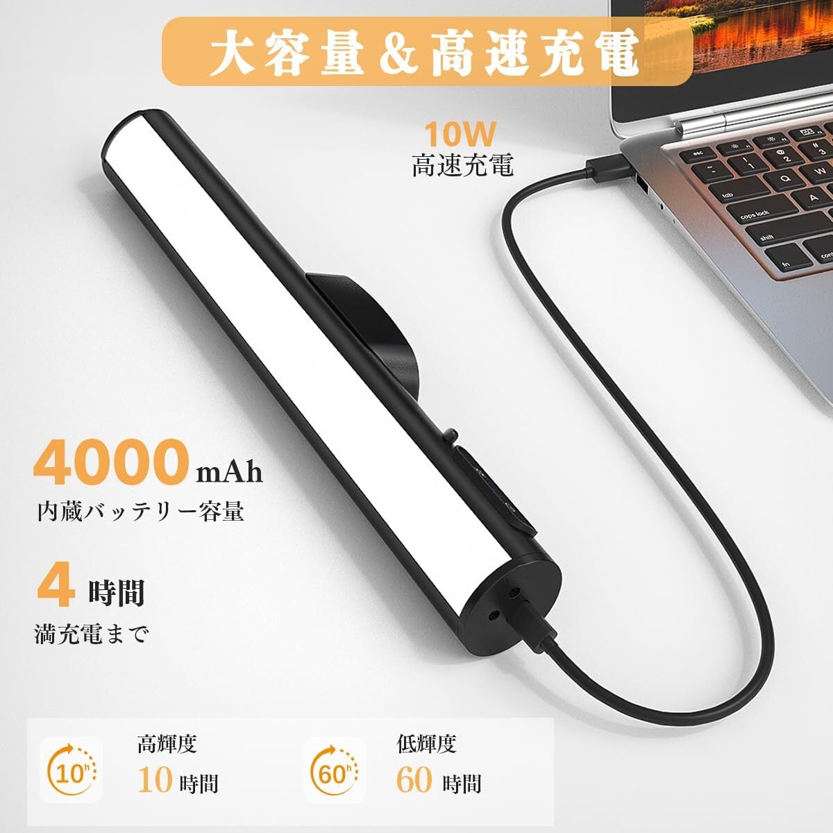 【長時間のバッテリー寿命】この卓上マグネットバーライトは、4000mAhのUSB充電式バッテリーを内蔵しており、最低出力で60時間、最高出力で10時間の連続使用が可能です。フル充電にはわずか4時間しかかかりません。