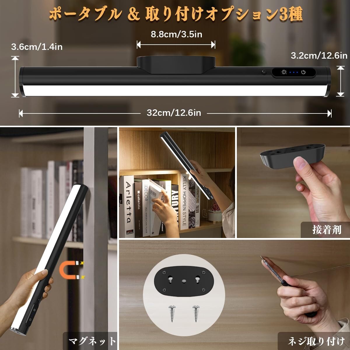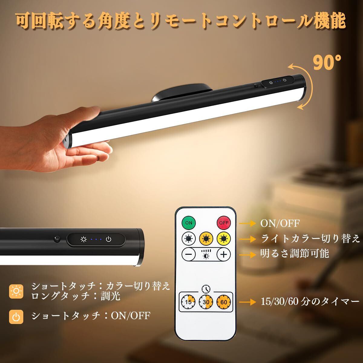 【パッケージ内容】充電式LEDデスクライト、リモコン、USB-C充電ケーブル、マグネット ベース、両面テープ、ネジ、日本語の取扱説明書、24×7カスタマーサービス、そして生涯。