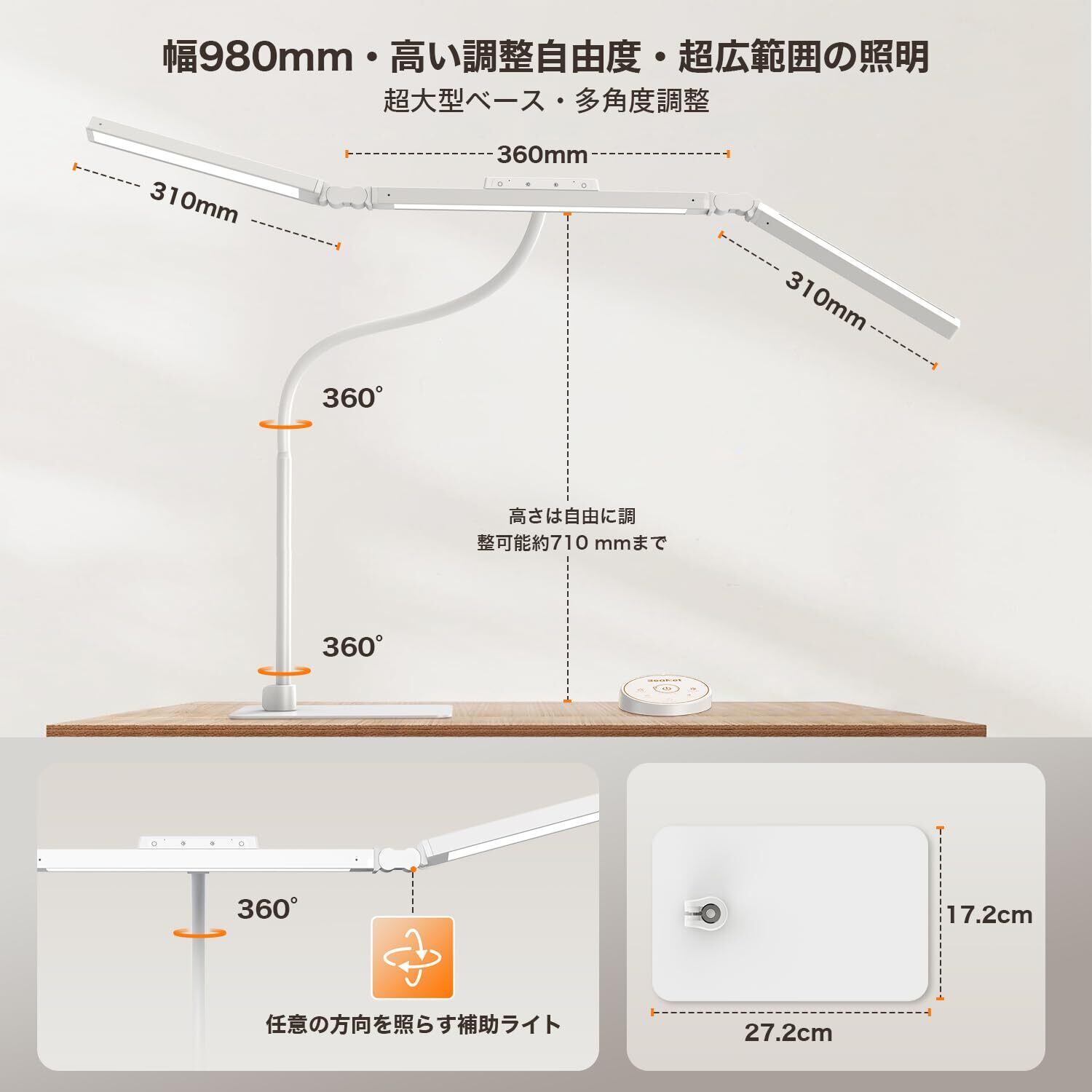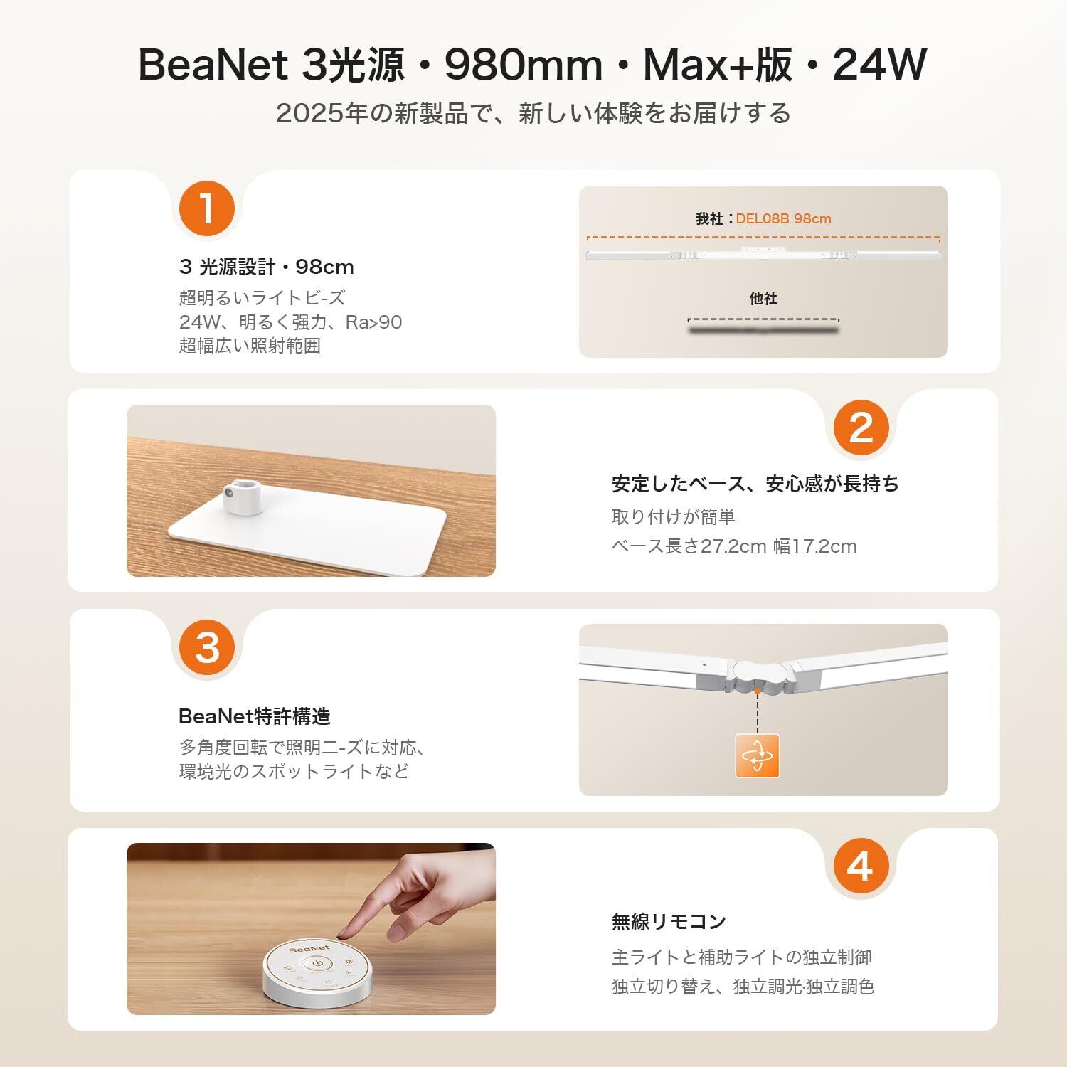 【3光源設計・T型Max+版・幅98cm】BeaNet 24W LEDデスクライトは、超高輝度LEDビーズを搭載した独特の3灯式設計です。明るく強力、幅広い照明がテーブルトップ全体を照らします。空間全体を同時に照らします。光は均一で柔らかく、ストロボも青い光も多重影もなく、目を保護する。消費電力:24W [PSE認証済]。