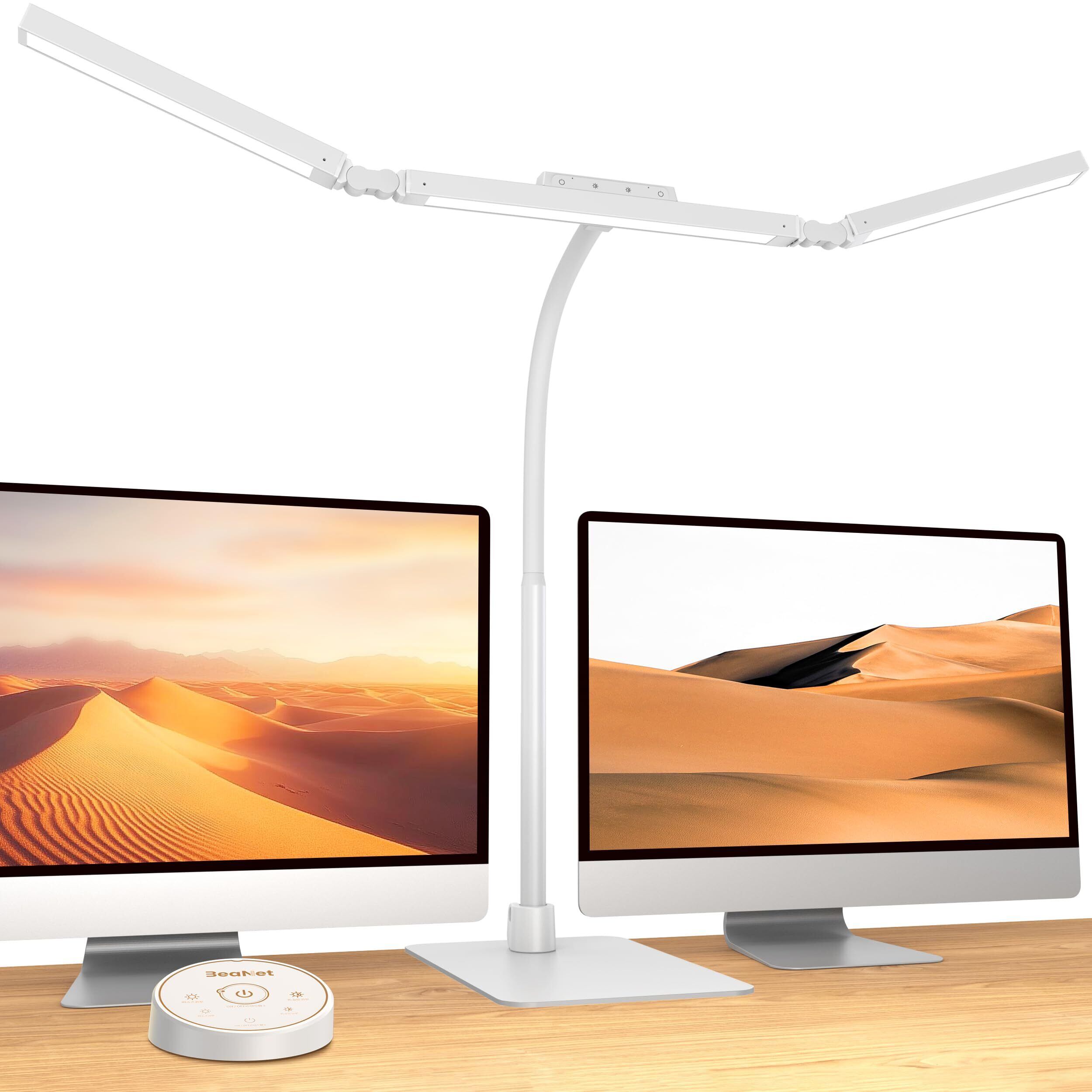 BeaNet デスクライト LED 「幅980mm・大型ベース・3光源Max+版・無線リモコン・24W・独立制御・2000Lx」 4段階調光調色 環境補助光 電気スタンド 「PSE認証済」幅広 スタンドライト 多角度調節 卓上ライト 目に優しい 仕事/勉強/読書 ホワイト BNT-DEL08B(T型 )