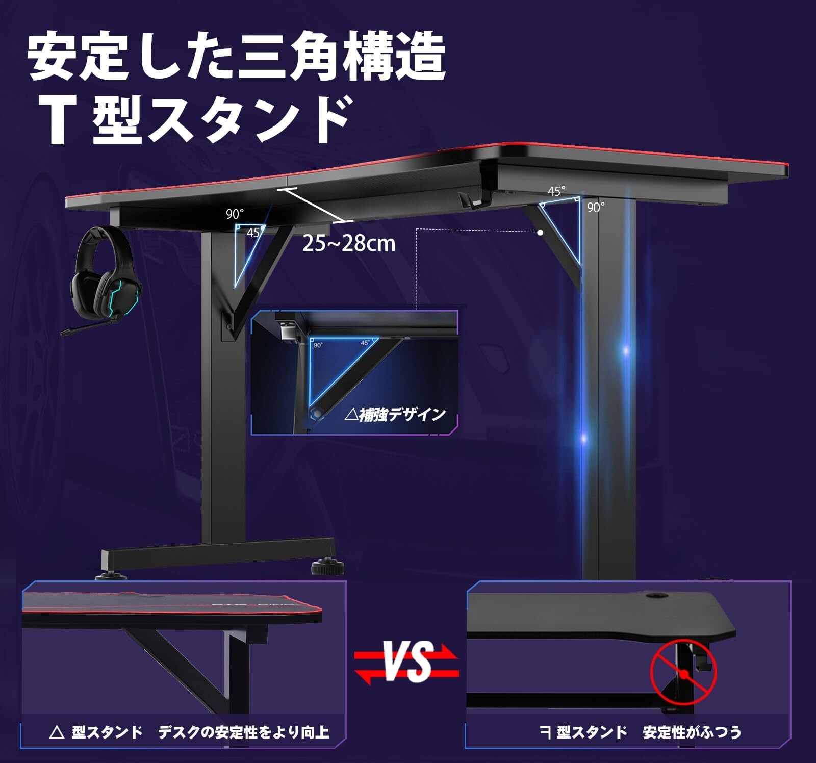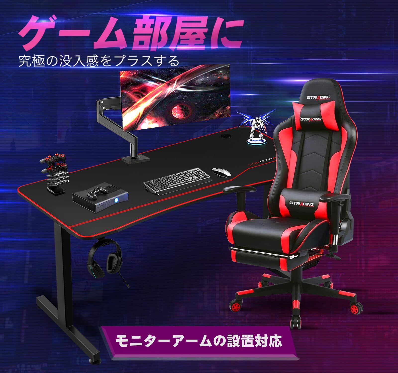 【ゲームプレイの環境を彩る】プロゲーマー向けに設計。天板はモニターアーム取り付け可能で、作業スペースをより有効利用できる。リアルな臨場感をプラスします。