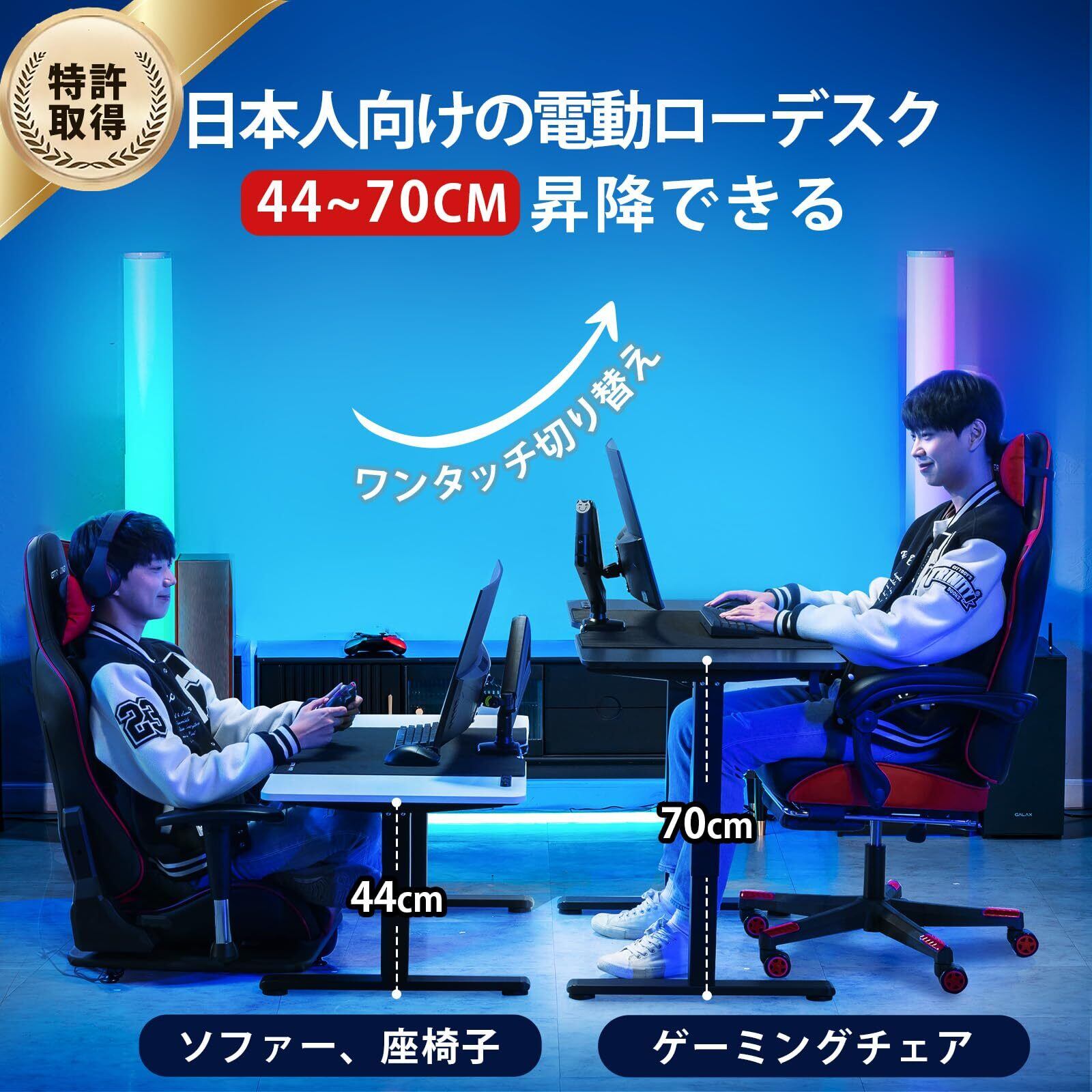 【取得の人気で革新的な昇降ローデスク】高さ46-72cm(2cm天板を含めて)昇降、日本人に合った電動昇降式ローデスクです。座椅子、レーシングシミュレーター、ソファ、デスクチェア、ベッドなど、さまざまな座席に対応しています。また、子供の成長に合わせて高さを調整できます。