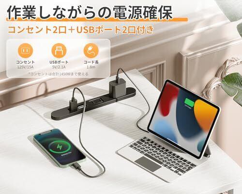 【コンセント付き、作業しながらの電源確保】コンセント2口(合計1450Wまで対応)+USBポート2口が付いております。席に座っているままで電源が取れ、ノートパソコンやスマホなどのチャージが超便利。電池残量を気にせずに長時間の作業が可能で、効率が大幅にアップ。