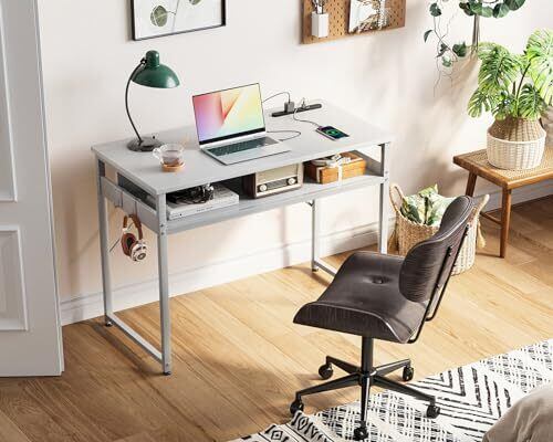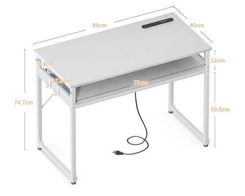 ODK 机 pcデスク パソコンデスク 幅80cm ゲーミングデスク 収納付き コンセント付き 勉強机 computer desk 桌子 ワークデスク 电脑桌 フック2個付き コンパクト テレワーク用 省スペース 組立簡単 白い
