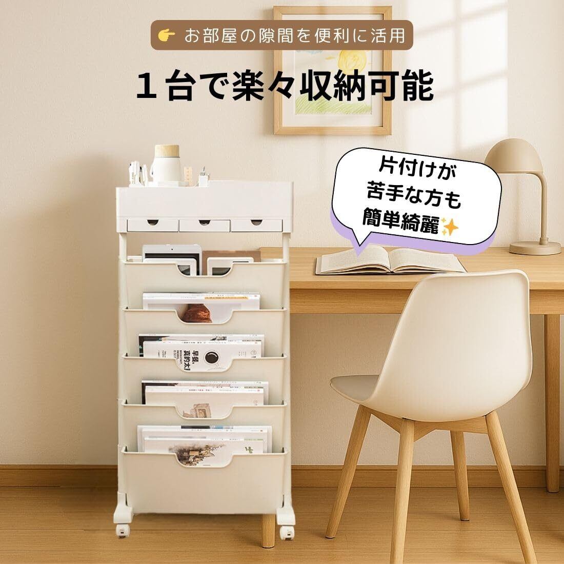 ファイルワゴン デスクサイド 段数調整可能 キャスター付き 楽々移動 5段 スリム デスク 子供部屋 リビング オフィス 隙間 A4ファイル ファイルワゴン 大容量 ラック 本棚 オフィス リビング 雑誌収納 組立簡単 収納用品 文具 絵本 漫画 雑誌 PC 1個 ホワイト