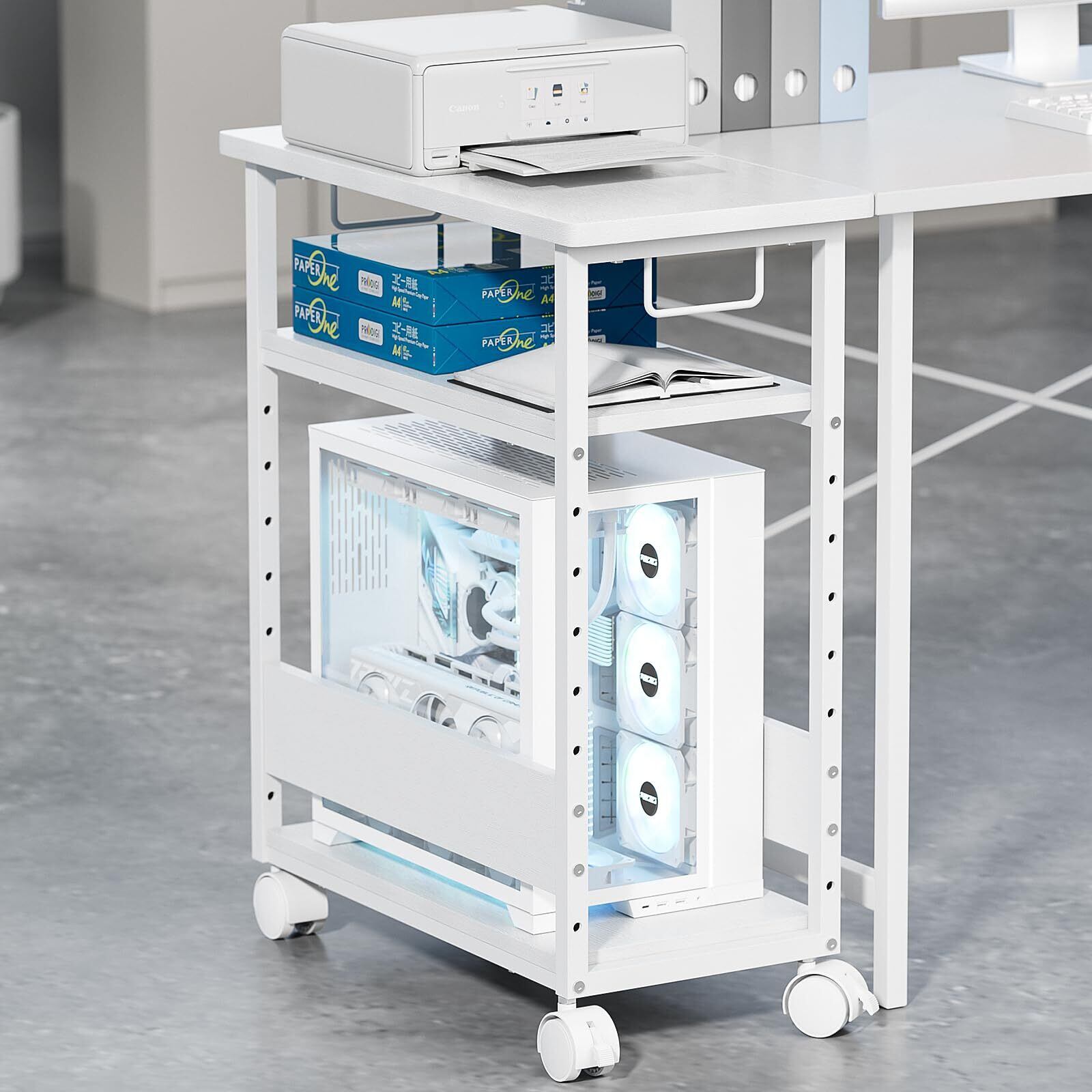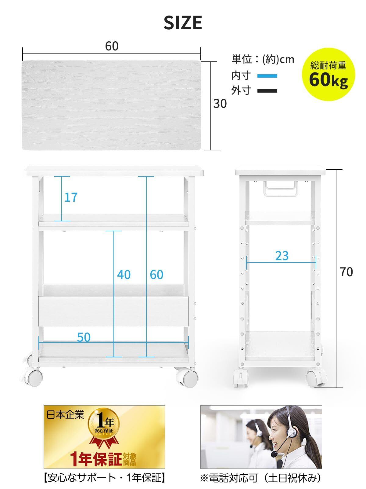 MIYOKI パソコンワゴン PCワゴン 複合機ラック キャスター付き 棚板高さ調節可能 幅60×奥行30×高さ70cm パソコン収納 木製 デスクサイド収納棚 ストッパー付き 移動便利 (ホワイト)