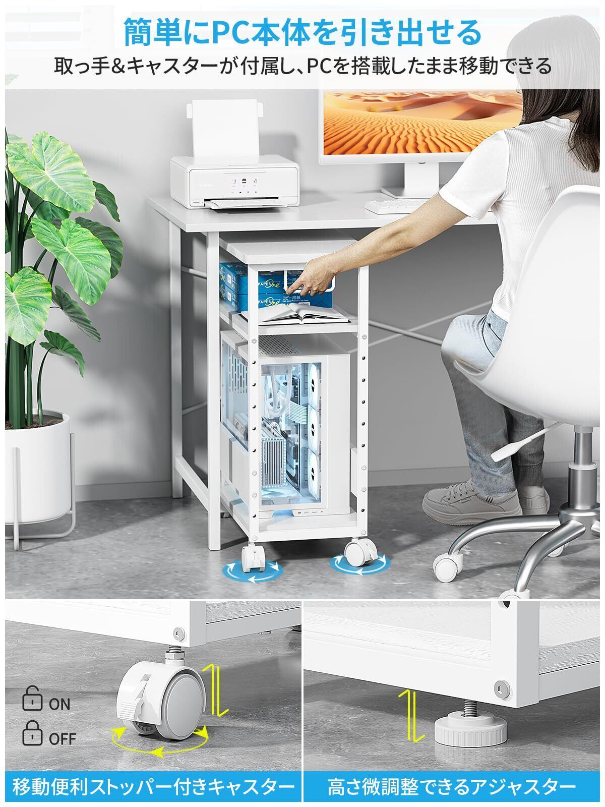 移動に便利なキャスター付き:四つの足に360°回転のキャスターが付いて、ラクラクに移動できて、掃除やメンテナンスに便利です。移動に便利な取っ手も付きます。配線時出し入れがしやすく便利!前2つにはストッパー付き、しっかりと止まって固定できる、デスク滑るのを防ぎ、動がさない時も安心できます。がたつき防止のアジャスターも4つがついており、必要に応じて使い分けが可能。