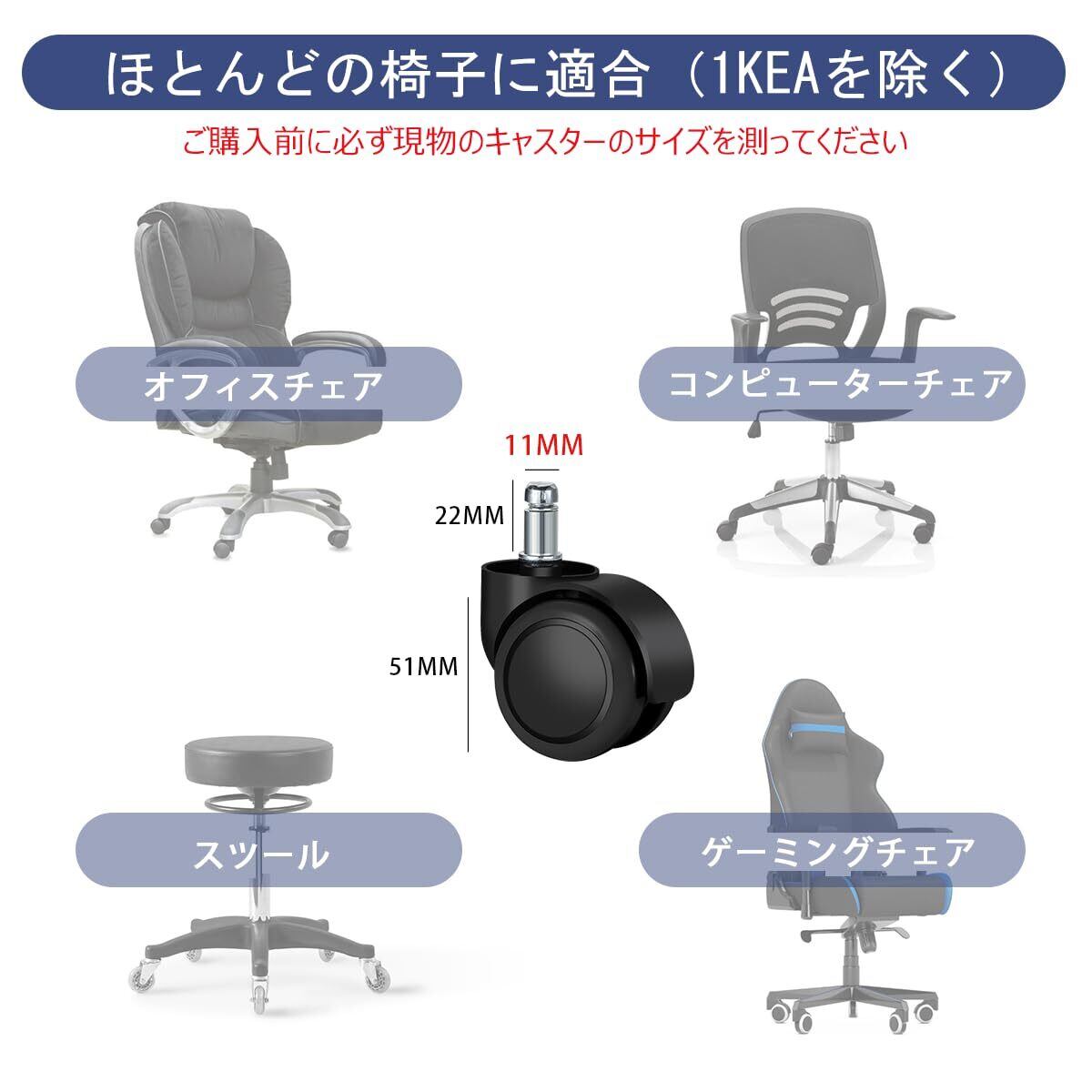 【幅広い応用シーン】椅子 用 キャスター,タイル、フローリング、ラミネートフロア、大理石、コンクリート又はビニル床に利用できます。サイズは11 ミリ x 22 ミリで、豪華な本革椅子、ゲーミングチェア、自宅やオフィス用事務チェアなど様々な椅子に取り付けることができるベストチョイスです。しかし、イケアの椅子に使えませんので、お買い上げの前にサイズを測定してください。