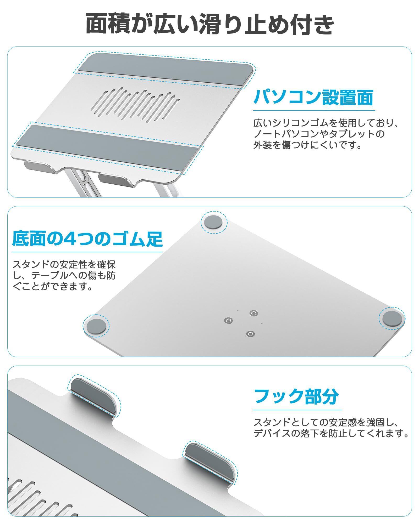 ●【滑り止めの面積が広い】:他社製品と比べ、ノートPCと接触する部分に広いシリコンゴムを使用しており、外装を傷つける心配もなく安心してご使用いただけます。さらに、滑り落ちを防止するストッパー部分や底面には4つのゴム足が付いており、スタンドの安定性を確保し、テーブルへの傷も効果的に防ぐことができます。