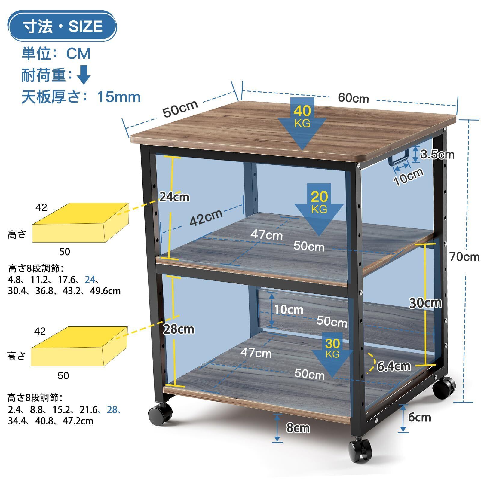 [耐荷重]天板45kg以上、中棚30kg 、下棚30kg、総耐荷重90kg ご注意:頻繁に移動する場合に、70kg以上の物を置かないでください。キャスターが破損になる可能性があります。