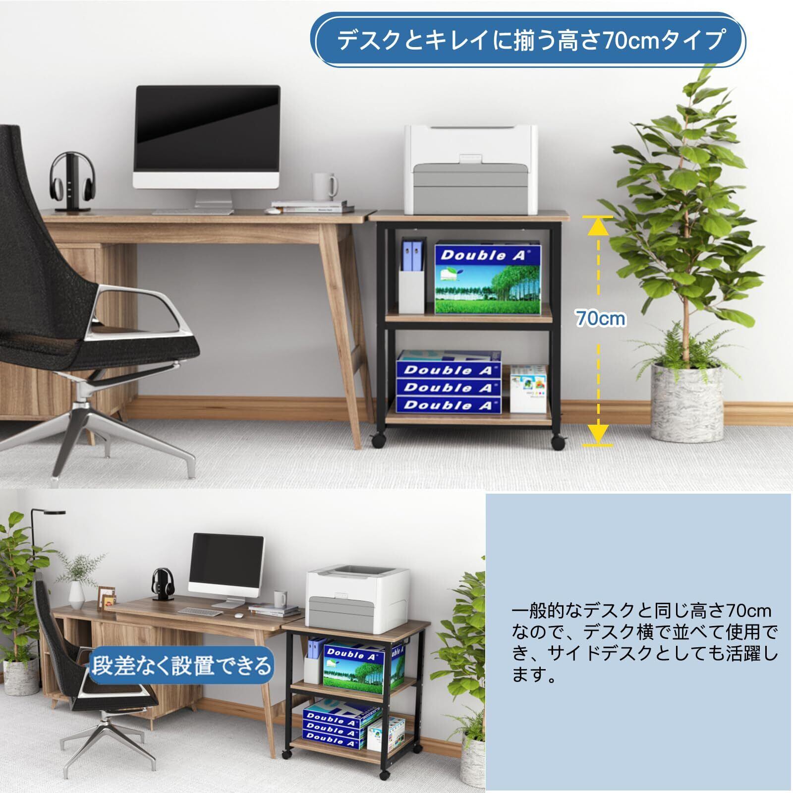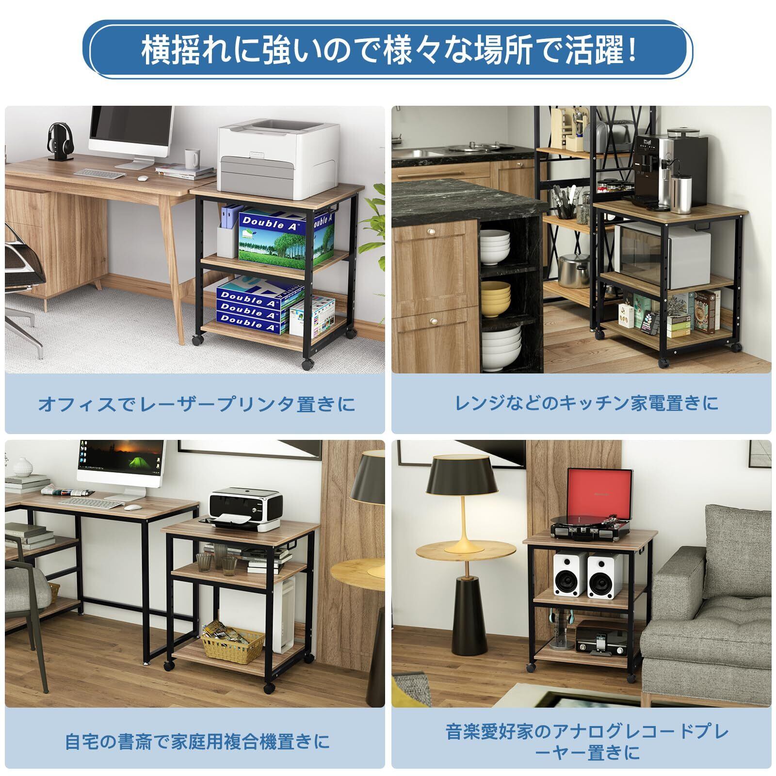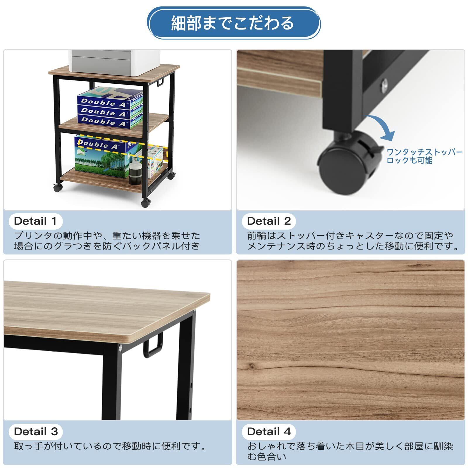 [細部までこだわる] プリンタの動作中や、重たい機器を乗せた場合にのグラつきを防ぐバックパネル付き 前輪はストッパー付きキャスターなので固定やメンテナンス時のちょっとした移動に便利です。 取っ手が付いているので移動時に便利です。 カラー : フレームカラーも黒で統一した、高級感を感じさせるブラック。現代のライフスタイルにスッと溶け込みます。