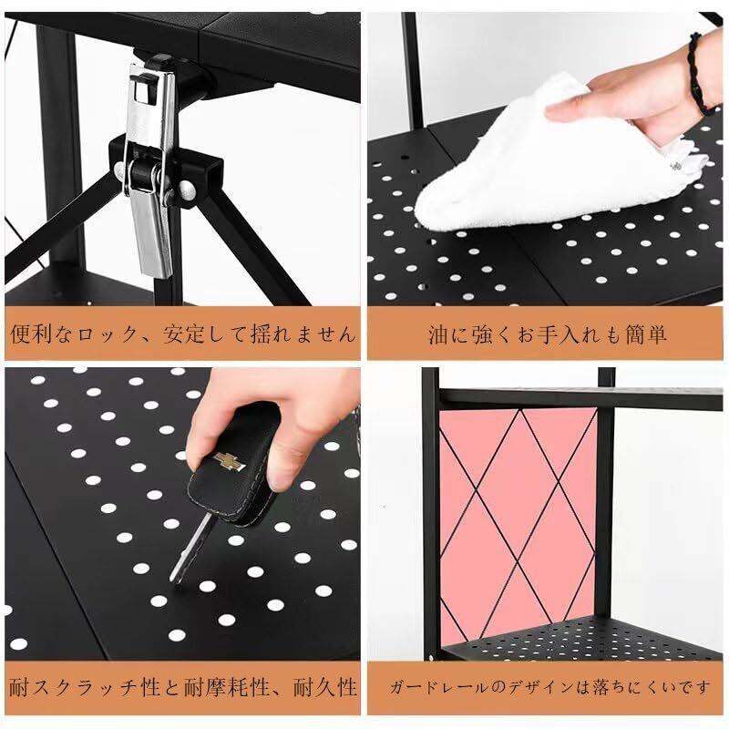 seacall 折り畳み メタルラック 折りたたみラック 4層 大容量 幅70CM 金属製の収納ラック 折り畳み棚 360°キャスター付きで移動可能 ック設置不要 家庭用収納ラック キッチン 寝室 応接間 書斎などに (ブラック, 四階)