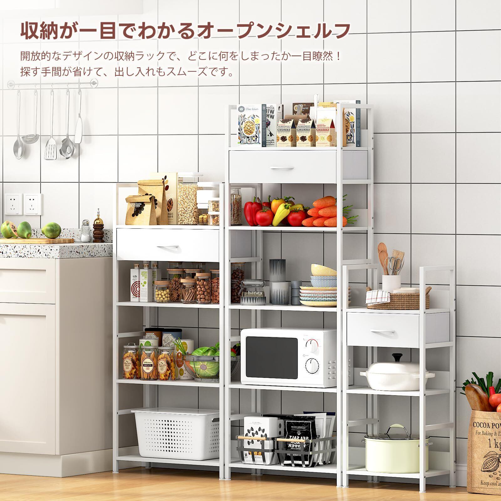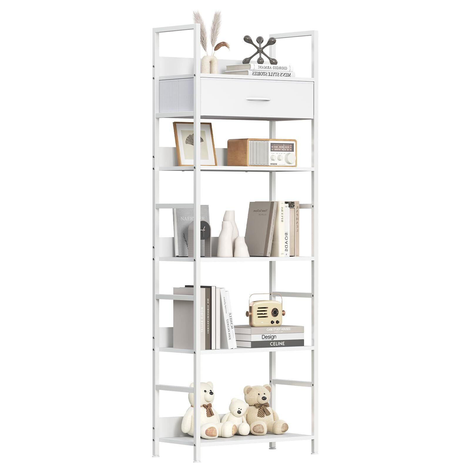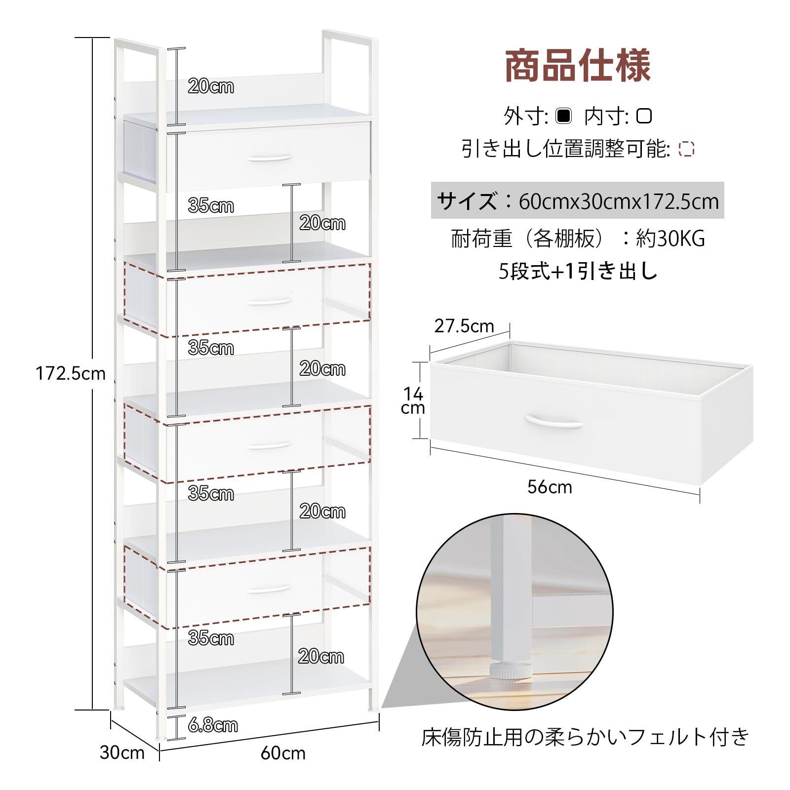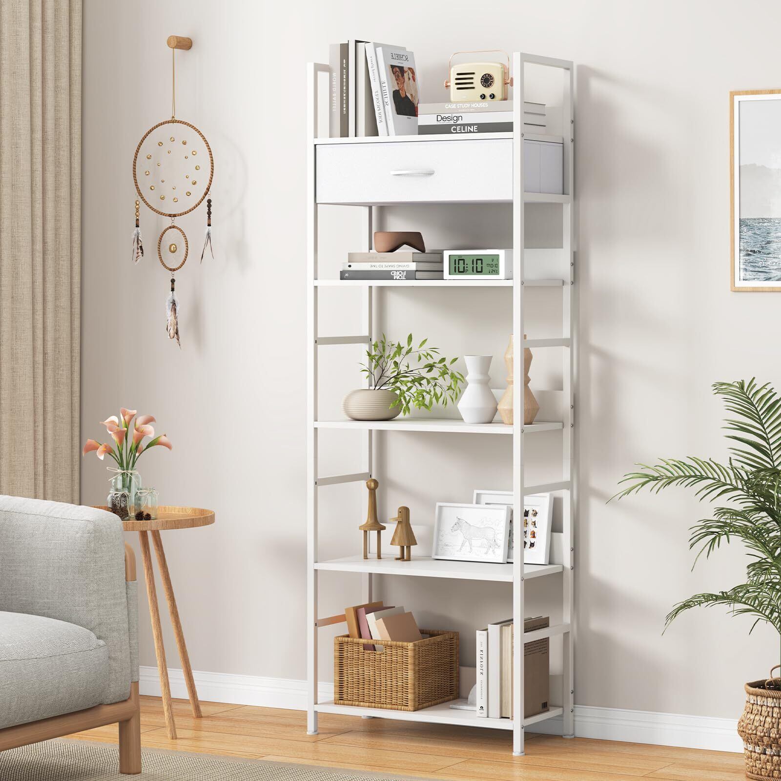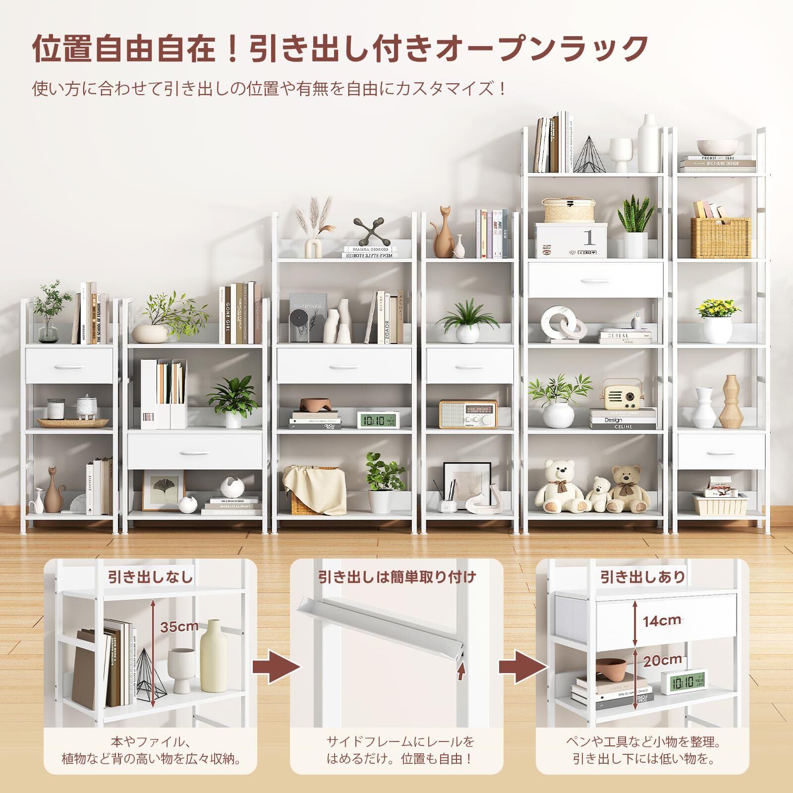 LunarLight オープンシェルフラック 幅60奥行30高さ172.5cm 5段ラック 収納棚 引き出し付き 引き出し位置調節可能 本棚 整理棚 L字型 アジャスト付き 収納ラック 省スペース スリム おしゃれ 組立簡単 工具不要 耐震転倒防止 (真っ白, 5段 幅60)