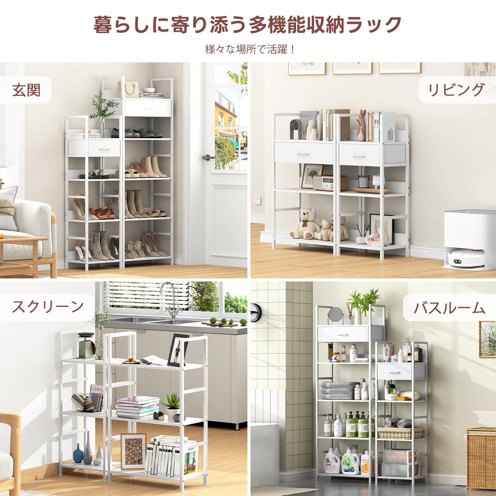 【使用シーン】スペースを取らずに収納スペースを確保できるラックです。シンプルでモダンなデザインが特徴で、リビング・玄関・キッチン・書斎・寝室・オフィスなど、あらゆる空間で大活躍。省スペースで収納スペースを確保できるラックです。スチールフレームと木製板の組み合わせのコンパクトデザインでワンルームや空間が狭いと感じている方にもおすすめです。