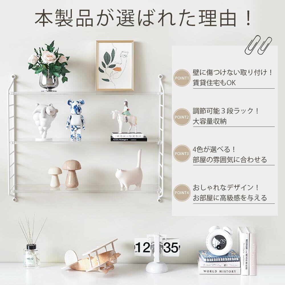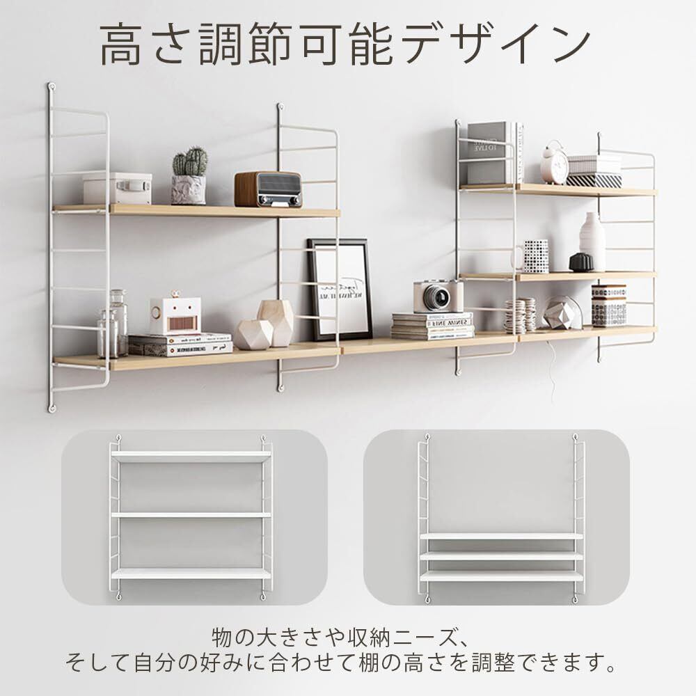 【調整可能な棚板で、自由自在な収納アレンジ】ウォールシェルフは、収納するアイテムのサイズや用途に応じて、棚の高さを自由に調整することが可能です。ディスプレイシェルフ、本棚、バスルーム収納棚などとして、様々なシーンに活躍しています。個々のニーズに合わせてカスタマイズできるため、機能性が高く、使い勝手が良いのが特徴です。限られたスペースでも、整理整頓がしやすいアイテムです。