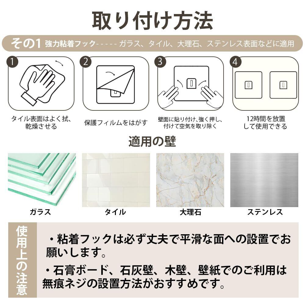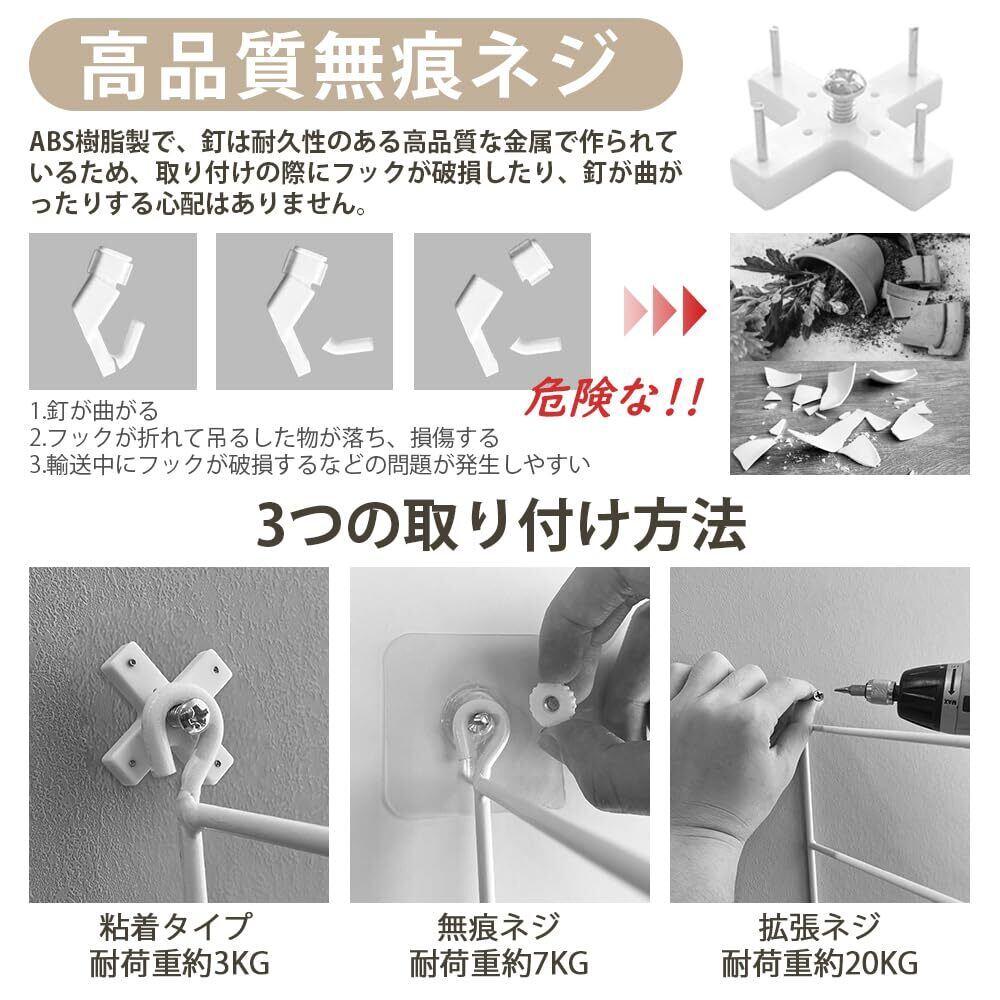 【壁を傷つけず簡単設置!選べる3つの取り付け方法】壁を傷つけることなく、簡単に取り付けられる3つの取り付け方法を備えたウォールシェルフです。粘着フック、無痕ネジ、拡張ネジの3種類の取り付け方法から選べるため、賃貸住宅や、壁に穴を開けたくない場所でも安心して設置が可能です。壁を傷つけず、しっかり固定できる点がオゥールシェルフの大きな魅力です。