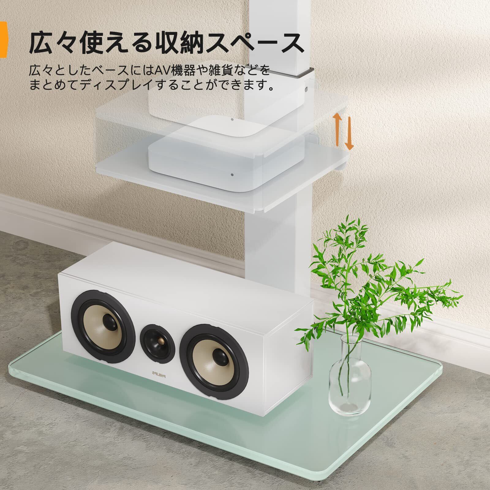 【大型テレビでも安定性抜群】Perlegear テレビスタンド 壁寄せは、台座が横幅52cm、奥行40cmと広くとられていて、本体重量も13.5kgあるので、どっしりと安定感がありテレビが倒れるような不安は一切ありません。底面に厚さ10mmの強化ガラスを採用して、支柱のパイプに直径8cmの頑丈かつ高品質の強化スチールを採用するので、さらに安定性が確保しました。スタンドに安全ロック機能が備わって、テレビをしっかり固定できて、大きなテレビでも安定します。