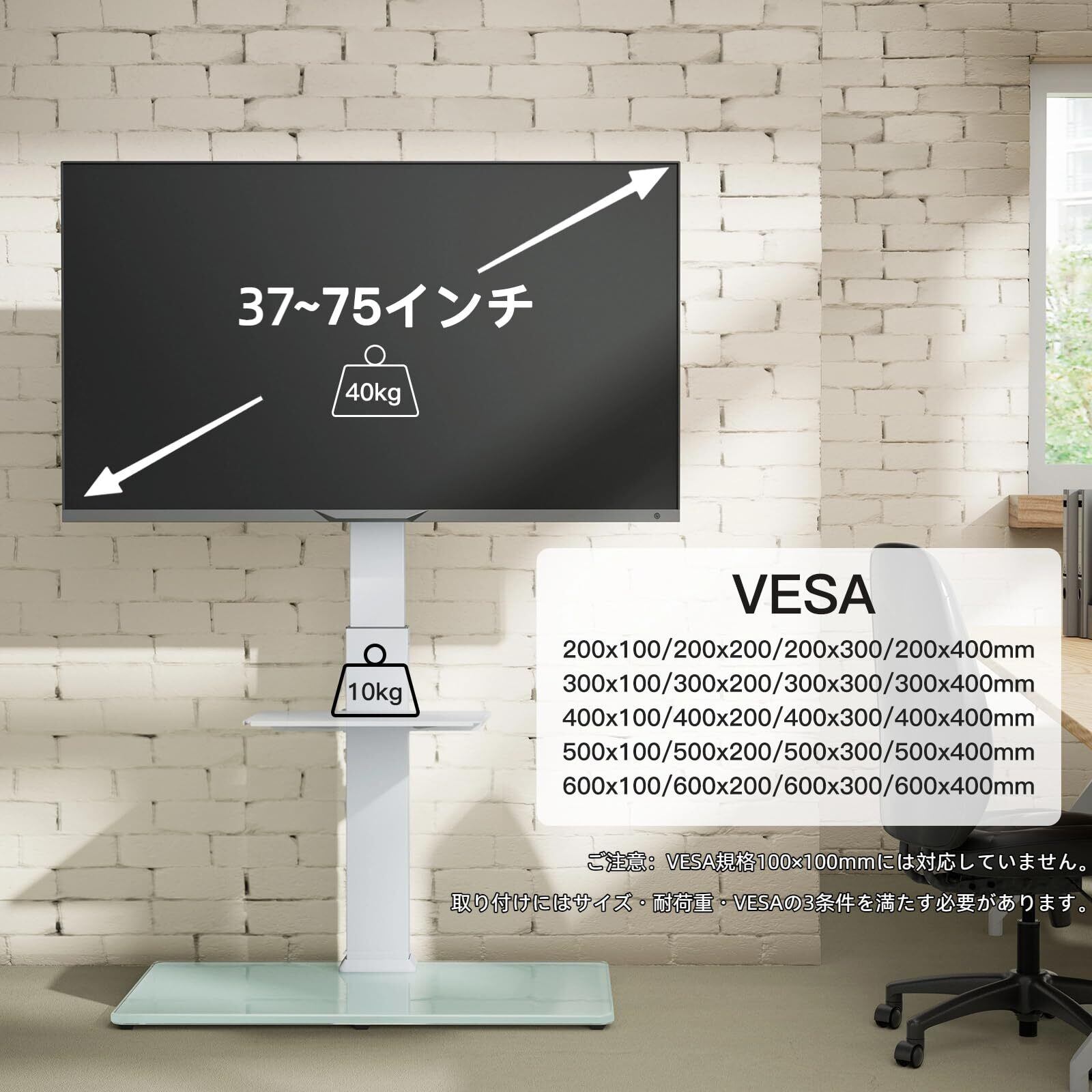 【取り付け可能なテレビ】取り付けにはサイズ・耐荷重・VESAの3条件を満たす必要があります。①対応サイズ:37~75インチ以内。②対応重量:40kg以内。③対応VESA: VESA規格とは、テレビ背面の取付穴の位置と間隔を指します。ネジ穴の間隔は、横200〜600mm・縦100〜400mmの範囲である必要があります。④対応タイプ:平面タイプ/湾曲タイプ、凹凸/段差/干渉配線があるタイプに対応可能。⑤VESA取付用のネジには、以下のサイズがあります:M4×12mm、M4×30mm、M6×15mm、M6×35mm、M8×15mm、M8×35mm、M8×50mm。⑥ご注意:VESA規格100×100mmには対応していません。