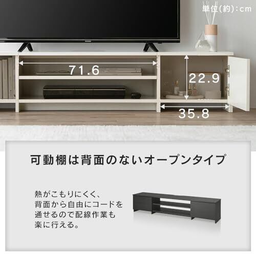 可動棚は背面のないオープンタイプ。熱がこもりにくく、背面から自由にコードを通せるので配線作業も楽に行えます。