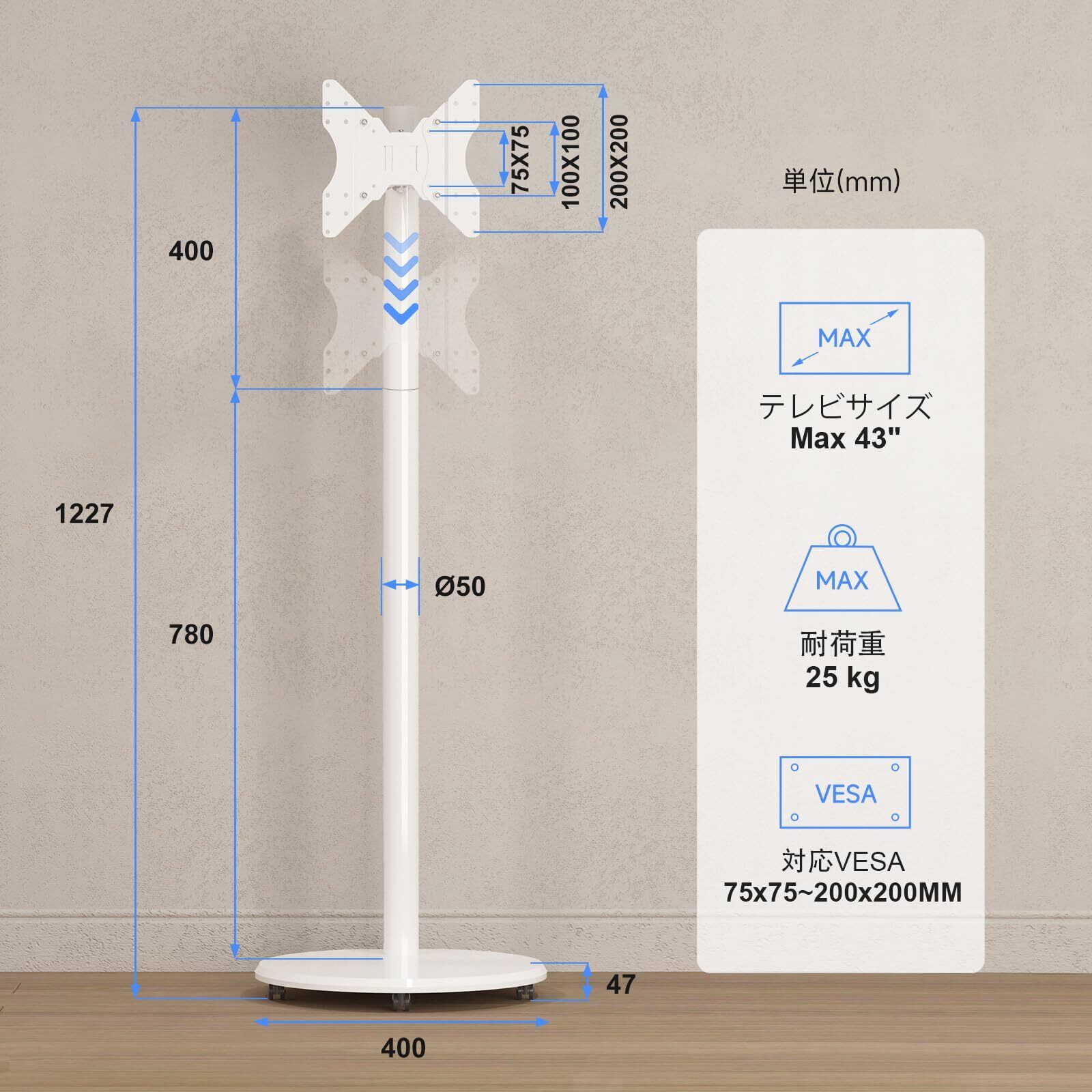 【取り付け可能なテレビ】75x75、100x100、150x75、150x100、200x200、150x150、100x200、150x200mmのVESA規格に対応しており、最大25kgの耐荷重を誇ります。49インチまでの小型テレビやモニターに最適です。ご購入前に、テレビのVESA規格、重量、サイズをご確認ください。