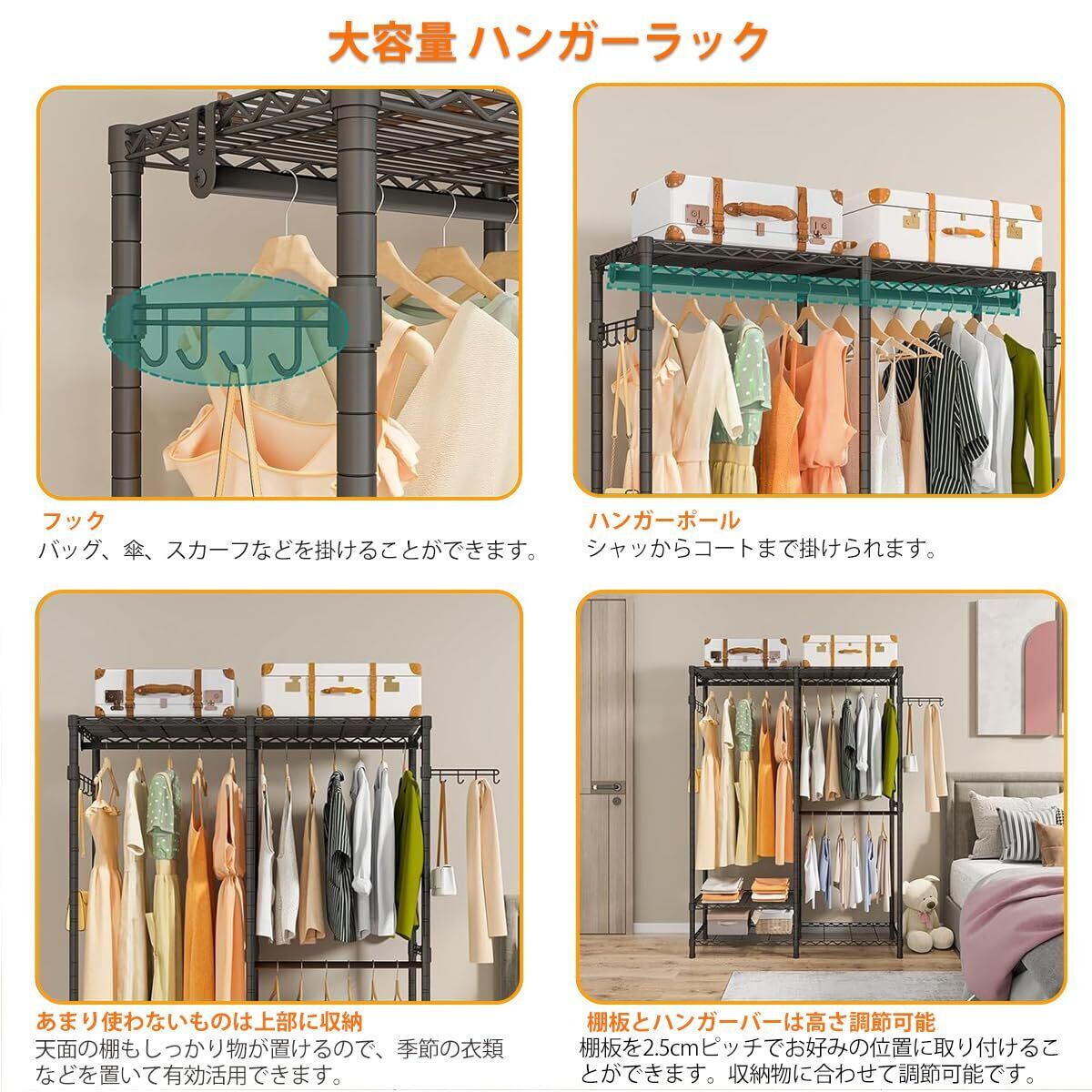 【ハンガーラック 頑丈】耐久性のあるスチールワイヤーとスリップ式のプラスチックスリーブ製、粉体塗装加工を施した、防錆性・耐熱性・耐油性に優れる頑丈なスチール製ポール、さらなる安定性を実現する、幅広のレベル調整足が付きます。こちらのはんがーらっくには、上部はフラットな天板で、収納箇所として活用することができます、 さらに、ほこりから衣類をまもります。 衣装ラックサイドのバーでフックが付いているので、さらに収納の幅が広がります。